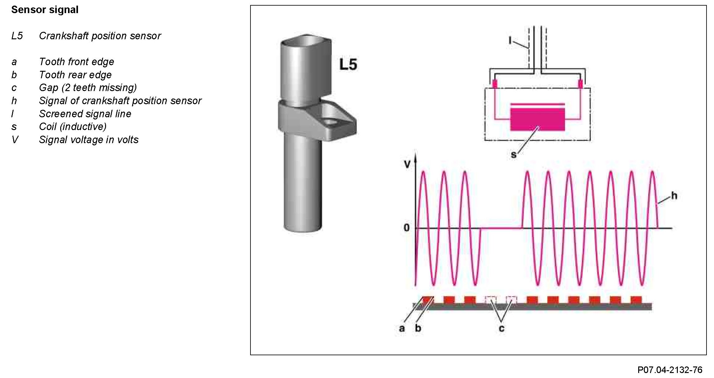 At the gap consisting of 2 missing teeth, no voltage is generated in the crankshaft position sensor. This gap is used to detect the TDC position in cylinders 1 and 6.