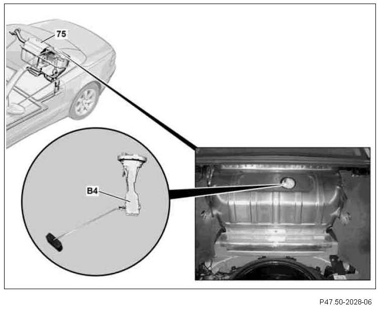 The fuel level sensor is located in the fuel tank at the front right on the fuel feed module.