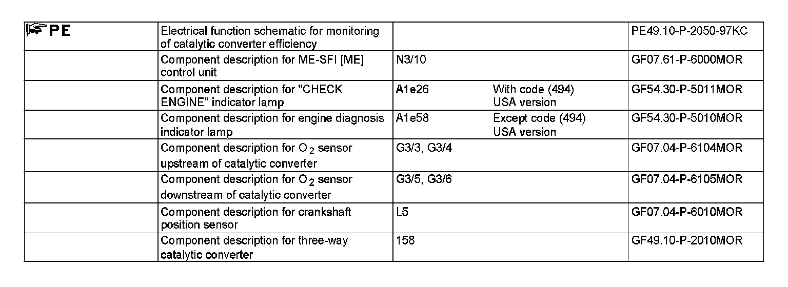 If a fault is detected, the ME-SFI [ME] control unit actuates the engine diagnosis indicator lamp (A1e58) (or with code (494) USA version, the CHECK ENGINE indicator lamp (A1e26)) on the instrument cluster (A1) over the engine compartment CAN (CAN C).