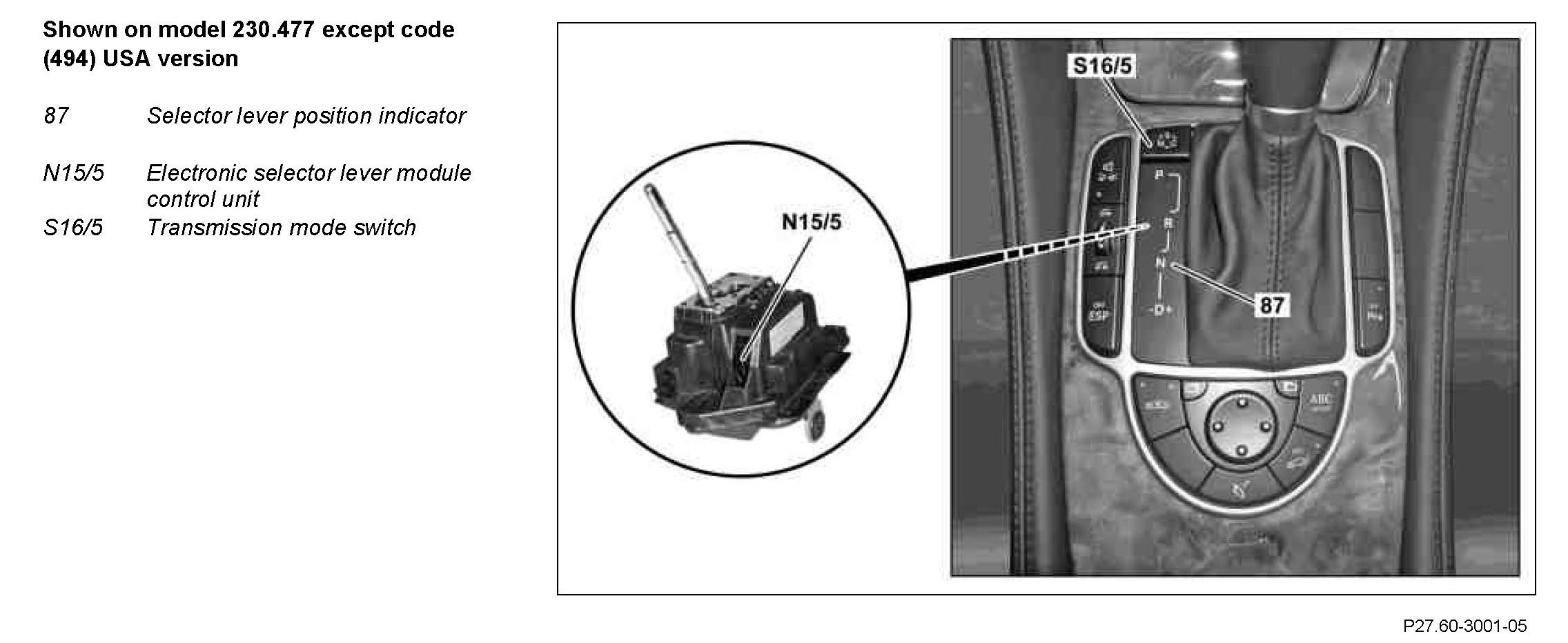 The electronic selector lever module control unit is flashable. The software for the electronic selector lever module control unit can be renewed or updated using Star Diagnosis.
