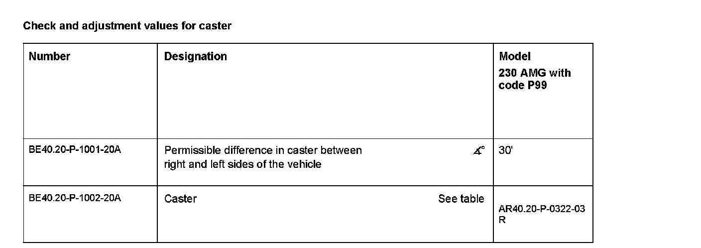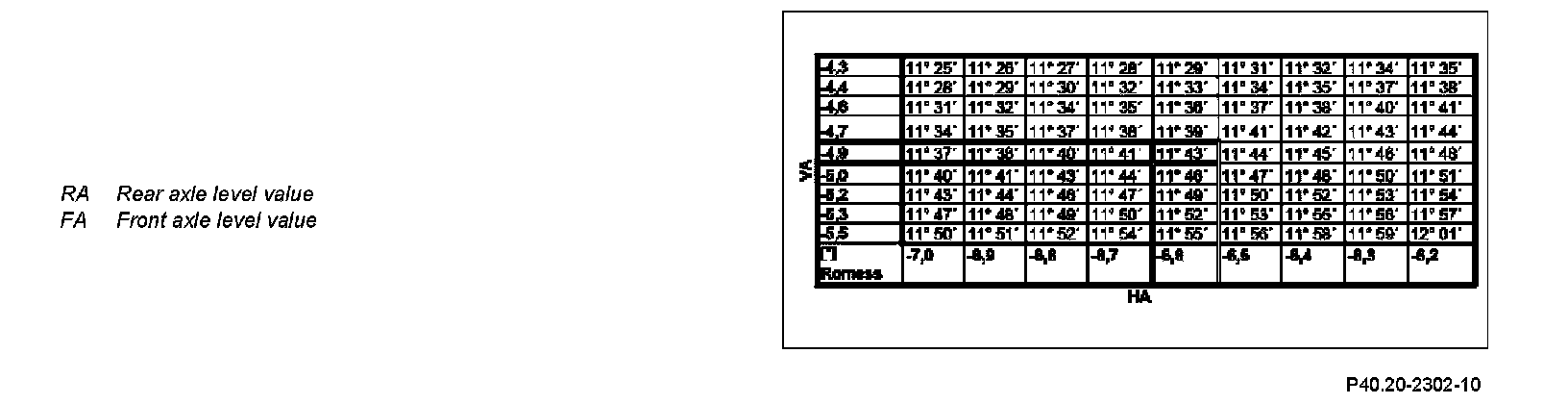 1 Obtain the caster value from the table taking into account the front axle (FA) level values and rear axle (RA) level values measured previously.