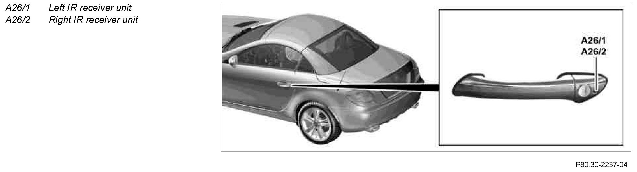 The IR receiver unit receives the infrared signals from the transmitter key (A8/1) and relays them to the left door control unit (N69/1) or the right door control unit (N69/2). The door control unit transmits the signals via interior CAN.