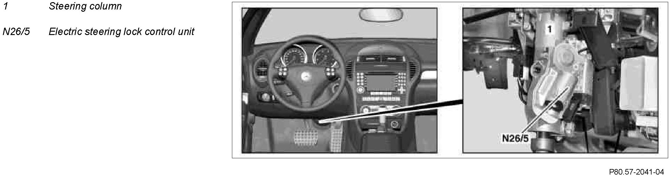 The electric steering lock control unit processes information from the EIS control unit and is connected with it via a bi-directional, serial data line