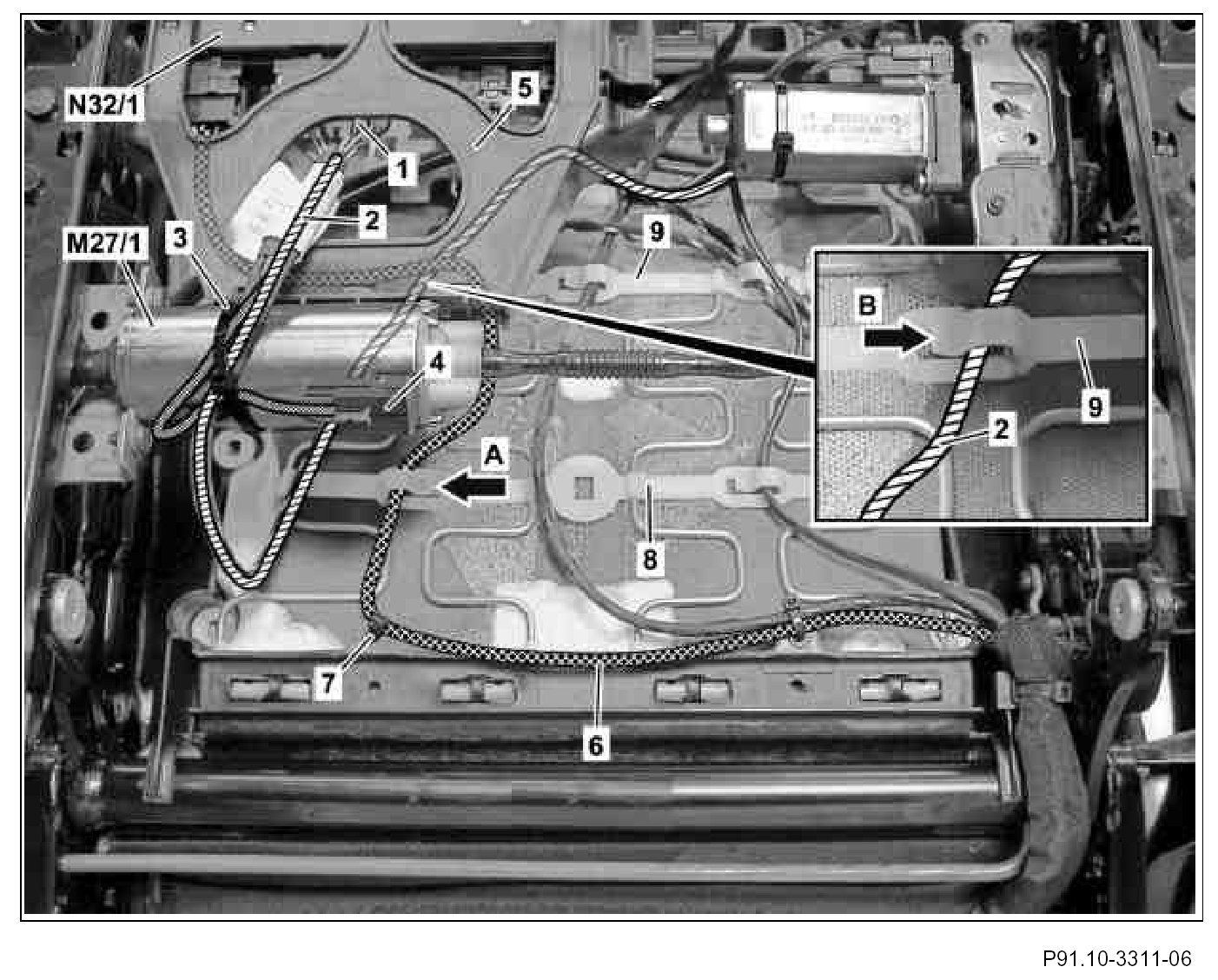 6. Unclip seat fore/aft adjustment motor electrical wiring harness (2) from wiring harness bracket (9) (arrow B).