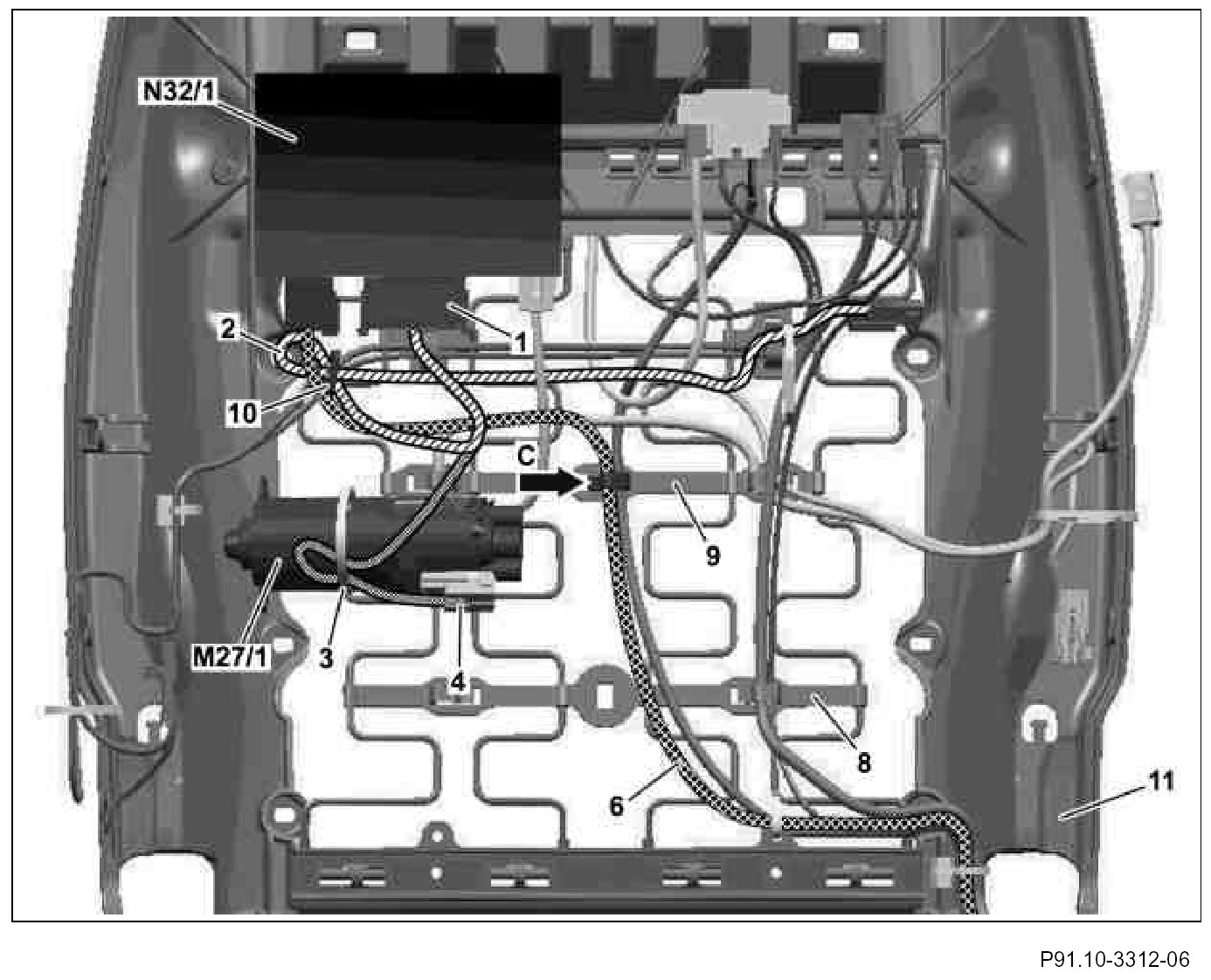 11. Clip backrest angle adjustment motor electrical wiring harness (6) into wiring harness bracket (9) (arrow C).