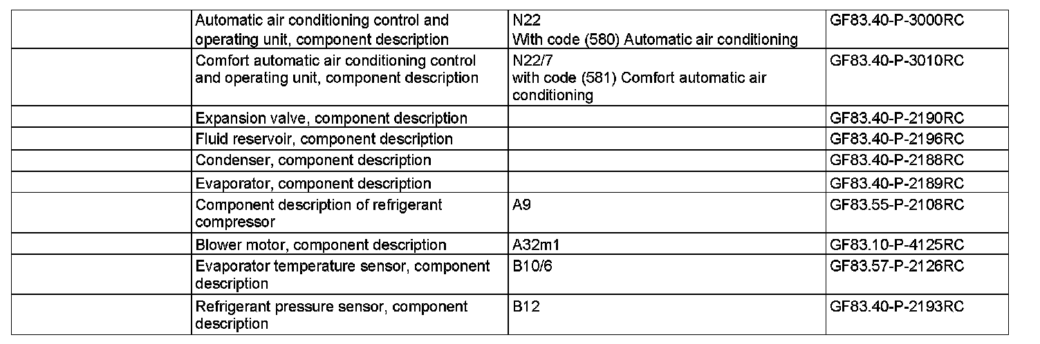 The vehicle interior is cooled via the refrigerant circuit depending on the setting at the AAC [KLA] control and operating unit (N22) (with code (580) Automatic air conditioning) or at the comfort AAC [KLA] control and operating unit (N22/7) (with code (581) Comfort automatic air conditioning). The individual components are interconnected through lines and form a closed system.