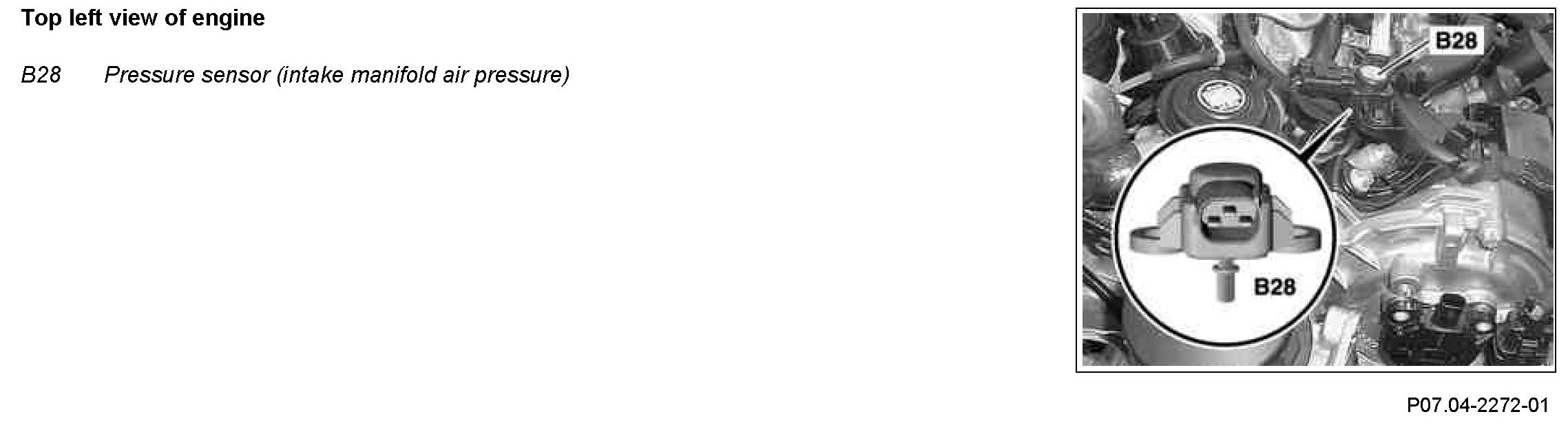 The pressure sensor detects absolute pressure in the variable intake manifold (intake manifold air pressure). The intake manifold air pressure serves the ME-SFI [ME] control unit (N3/10) when starting the engine for recognizing the air mass and for a running engine for monitoring the measured air mass.