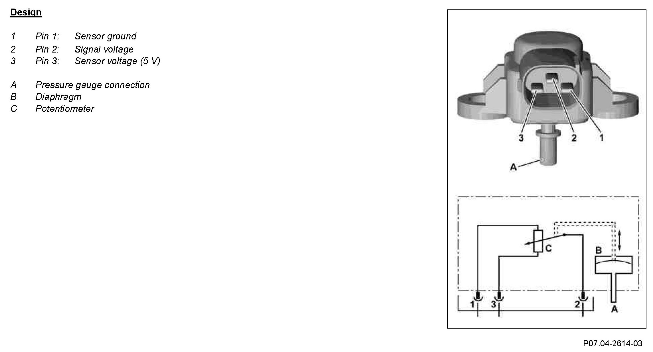 The intake manifold air pressure deforms the membrane which acts on a potentiometer. This alters the resistance value of the potentiometer and influences the signal voltage which serves the ME control unit as information about the intake manifold air pressure.