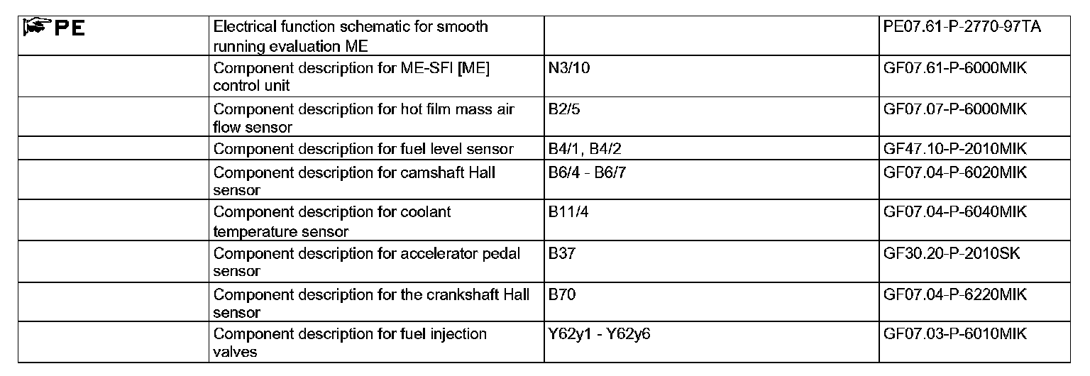The ME-SFI [ME] control unit stores the smooth operation characteristics of the engine during a deceleration phase accelerator pedal not operated) when uniform smooth operation is present. These are required as a comparison parameter for misfire detection.