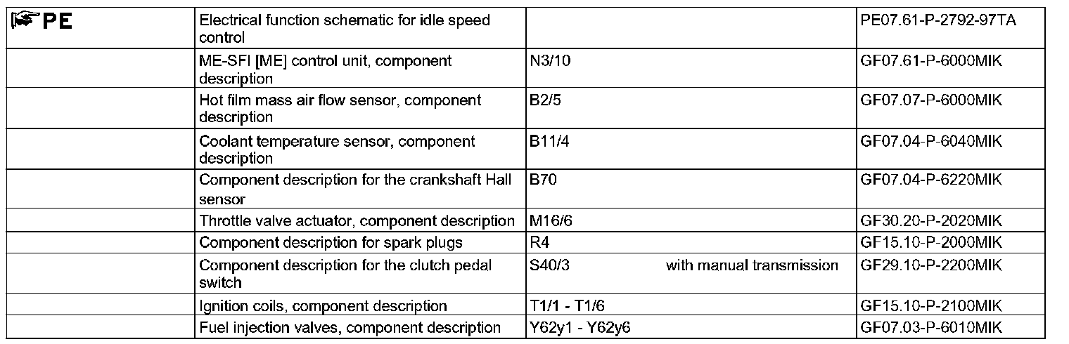 The ME-SFI control unit regulates the idle speed through the throttle valve actuator (M16/6) and adapts the injection time of the fuel injection valves (Y62) according to variations in the air mass.