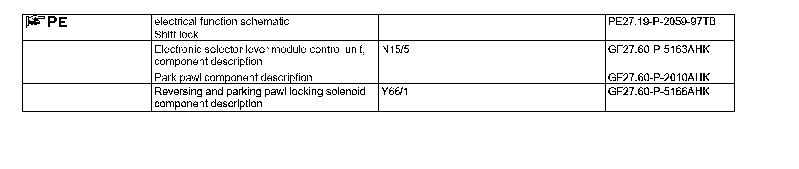 Upon reception of a valid drive authorization code from the electronic ignition switch control unit (N73) and if the brakes are detected by the ESP, SPS [PML] and BAS control unit (N47-5) via the engine compartment CAN (CAN C), the electronic selector lever module control unit actuates the locking solenoid for the backup and park pawl (Y66/1).