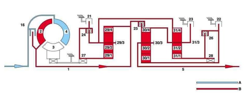 The direct gear ratio of 4th gear (i = 1) means that no torque or speed conversion takes place. Power is transmitted from the input shaft (1) via the 3 blocked planetary gear sets to the transmission output shaft (5).