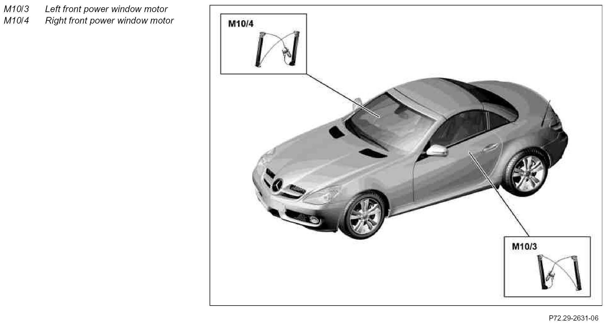 The left front power window motor and right front power window motors are DC motors rotating left or right depending on the polarity of the armature voltage. Both are protected against overheating by a temperature protection switch. They are equipped with two Hall sensors each for position recognition
