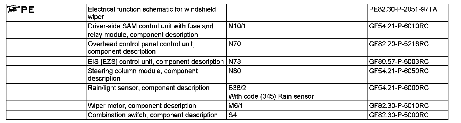 Touch wiping has priority over intermittent wiping. If during touch wiping the combination switch is in position "1", the interval period is restarted after the touch wiping is complete or a request of the rain/light sensor (B38/2) (with code (345) Rain sensor) is awaited.