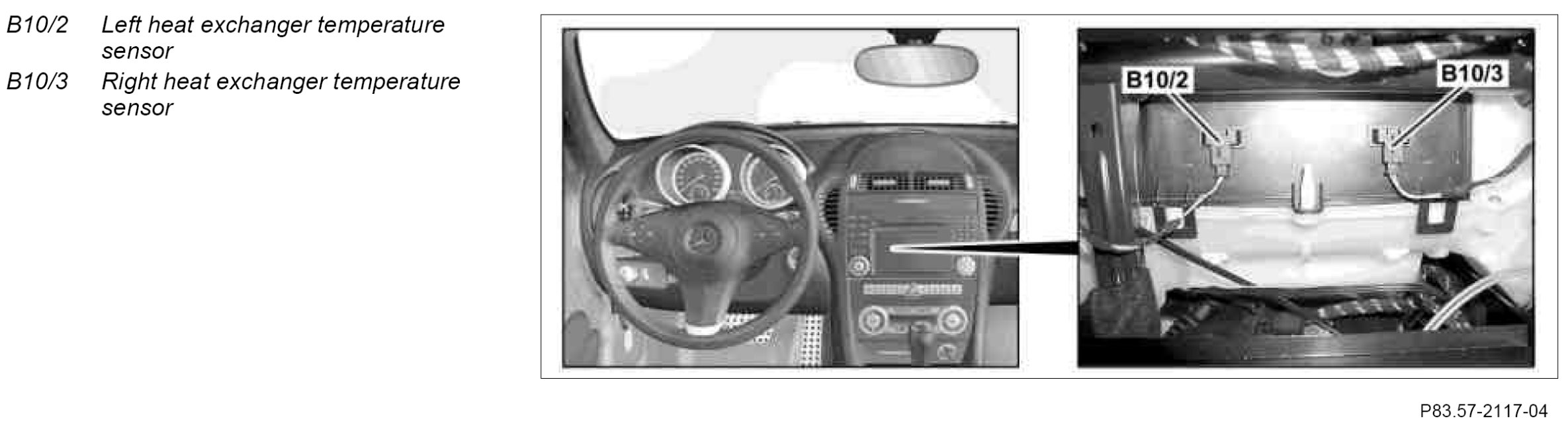 The heat exchanger temperature sensors are located in the air flow downstream of the heater heat exchanger in the heater or air conditioning housing below the instrument panel.