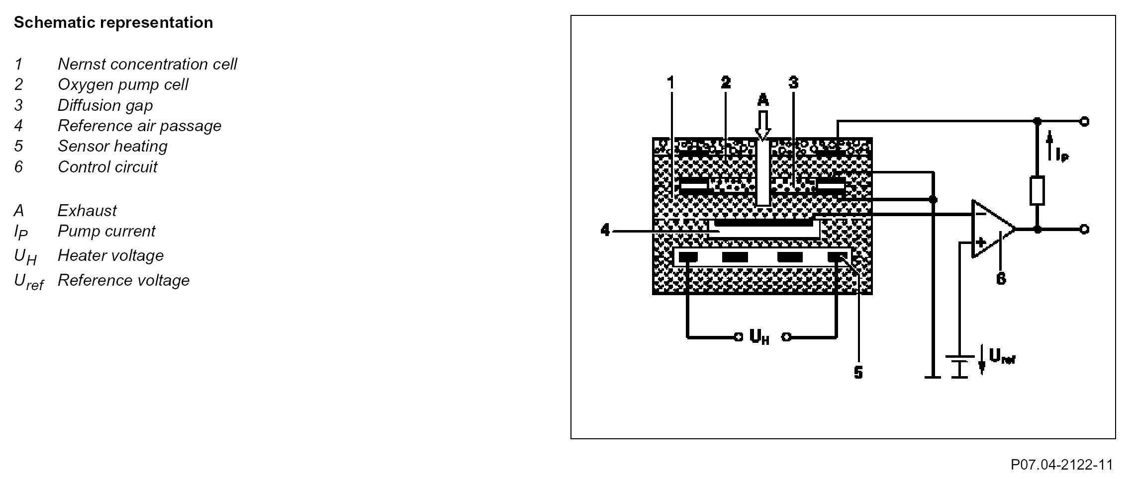 The O2 sensor upstream of CAT is designed as an insulated potential-free and planar (flat) wideband oxygen sensor
