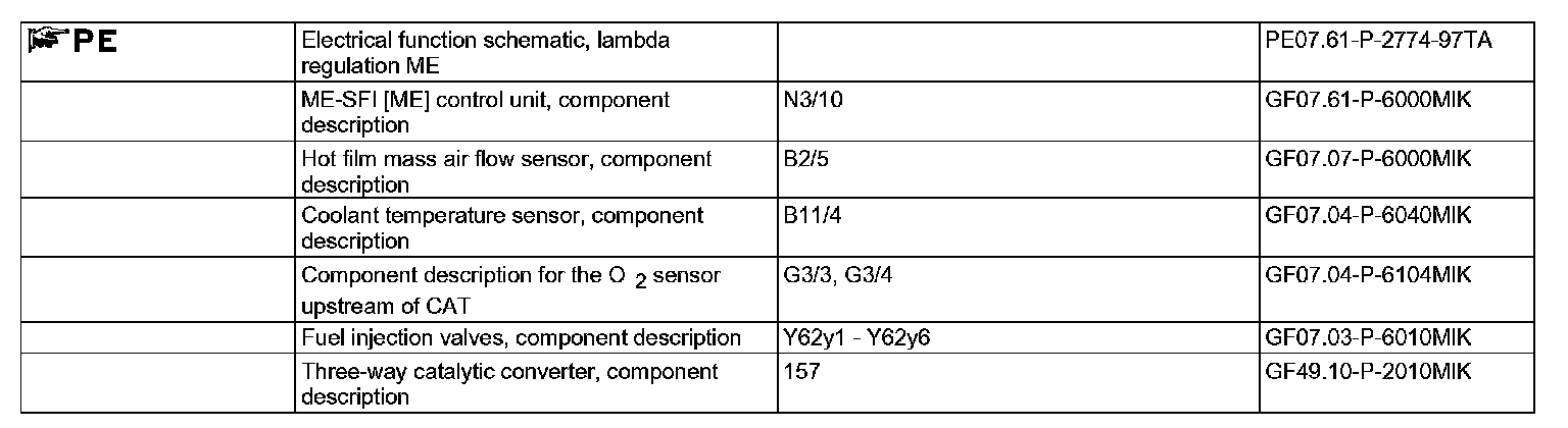 The O2 sensors upstream of the CAT react to the oxygen content in the exhaust and send the corresponding voltage signals to the ME SFI control unit. The control unit then varies the mixture composition by adjusting the injection time of the fuel injection valves (Y62), so that lambda=1. This process is repeated constantly (control loop).