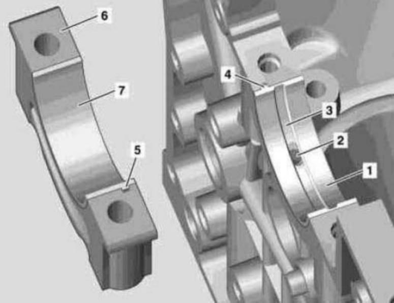 3 Insert bottom crankshaft bearing shells (7) into the crankshaft bearing caps (6). m Ensure that the anti-twist locks (5) of the bottom crankshaft bearing shells (7) are seated in the recess clearances of the crankcase (6).