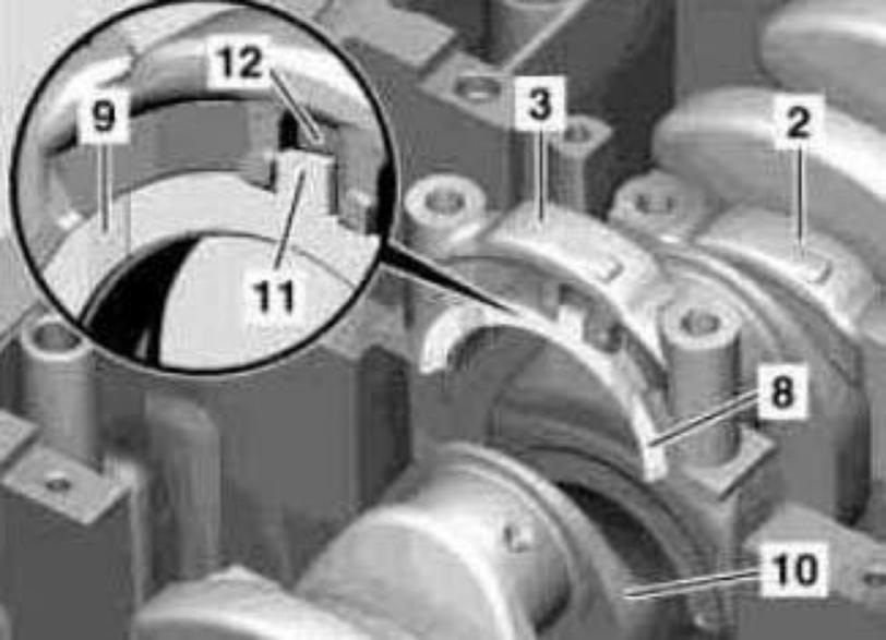 The anti-twist locks (11 ) of the thrust plates (8) must be seated in the grooves (12) of the fitted bearing cap (3).