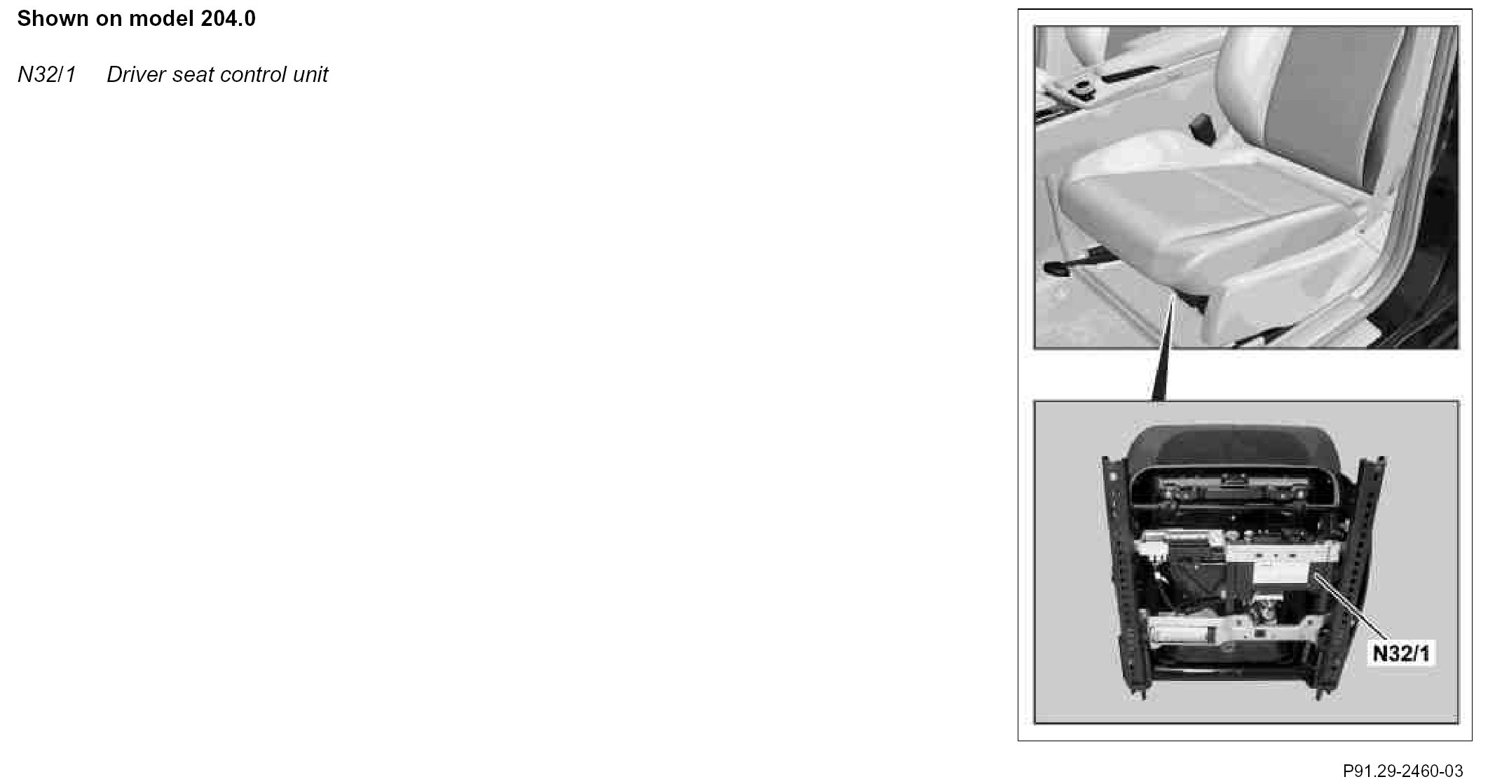 The driver seat control unit (N32/1) is beneath the seat surface on the frame of the driver seat.