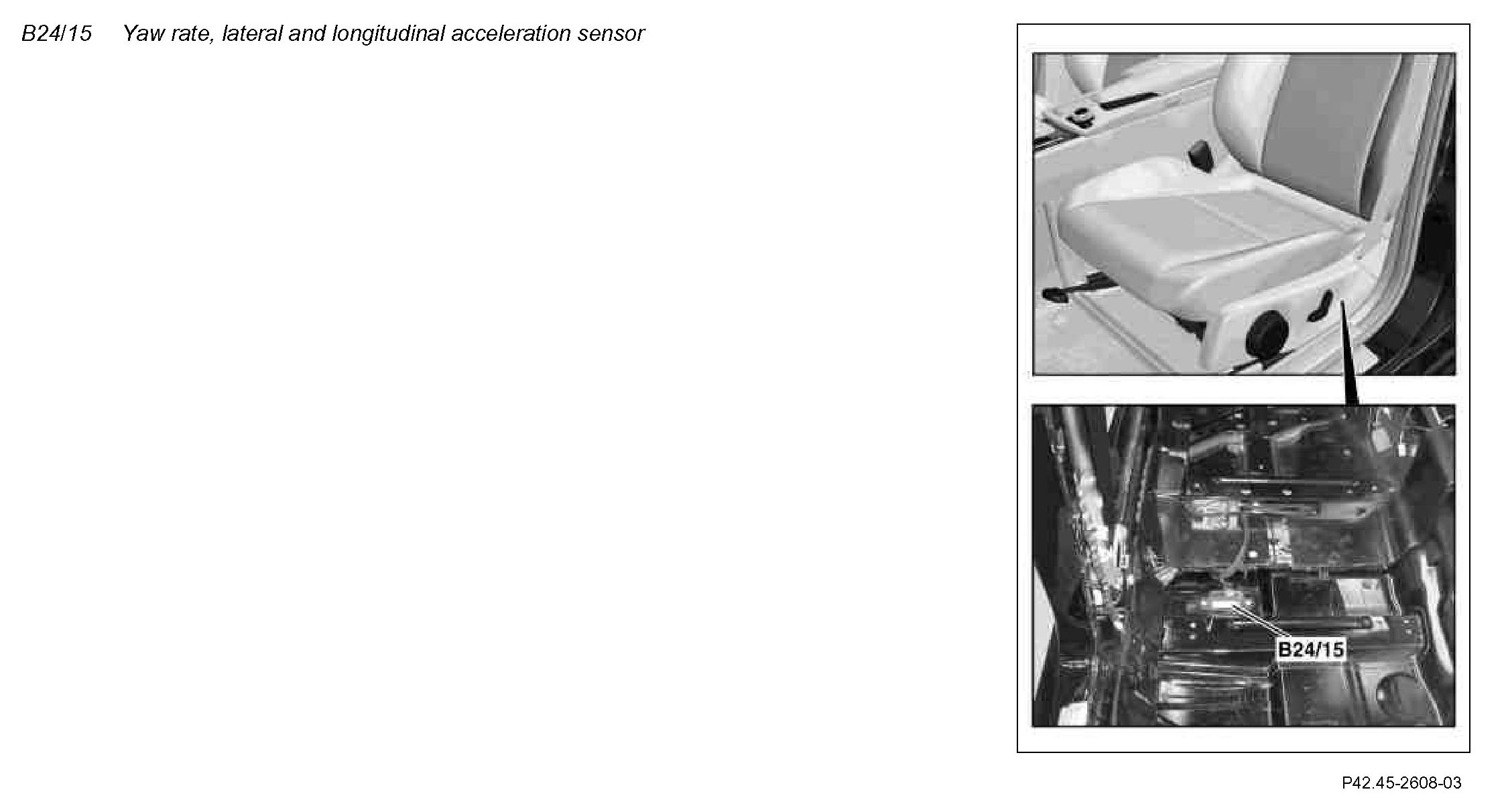 The yaw rate, lateral and longitudinal acceleration sensor is located below the driver's seat on the vehicle floor.