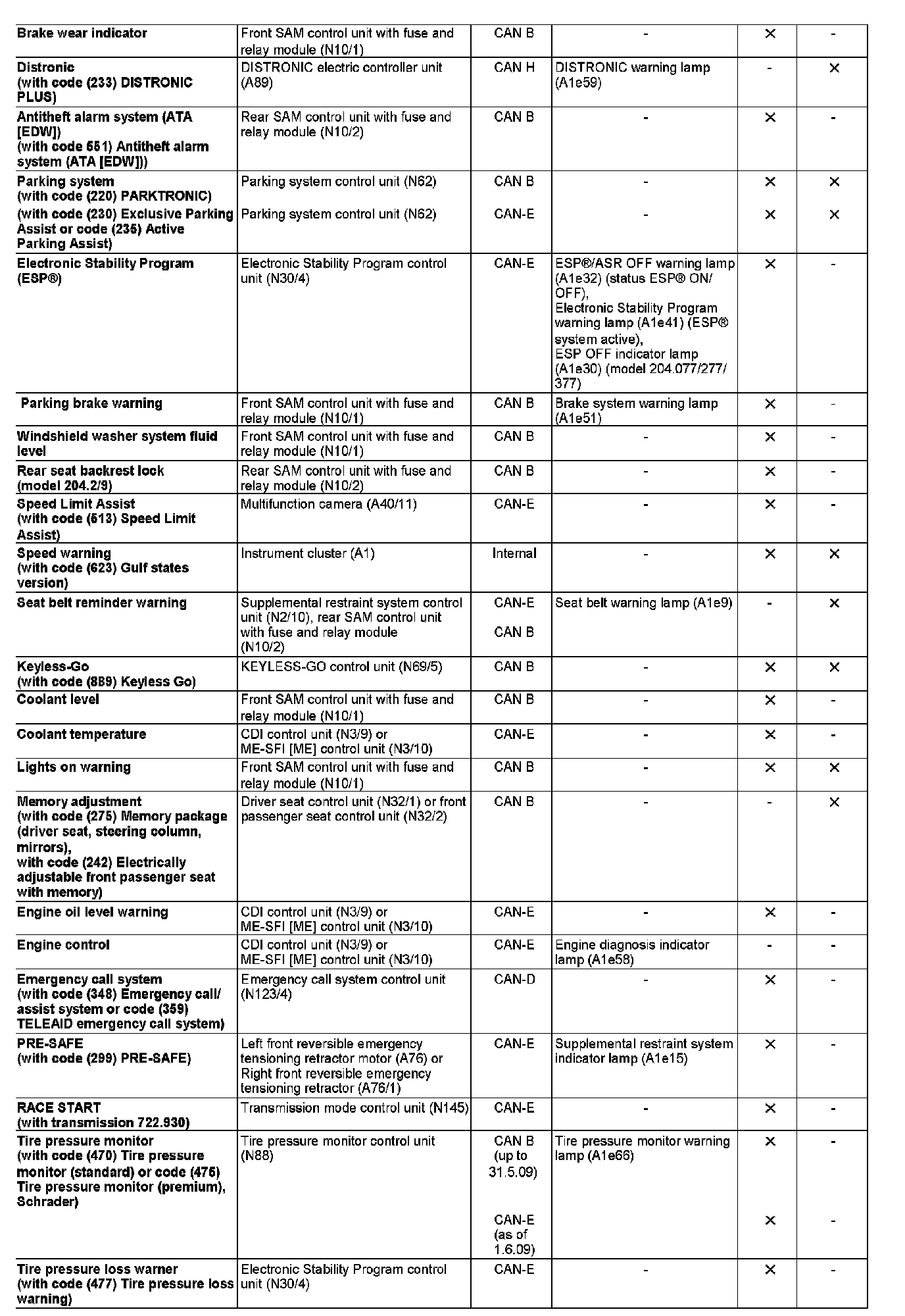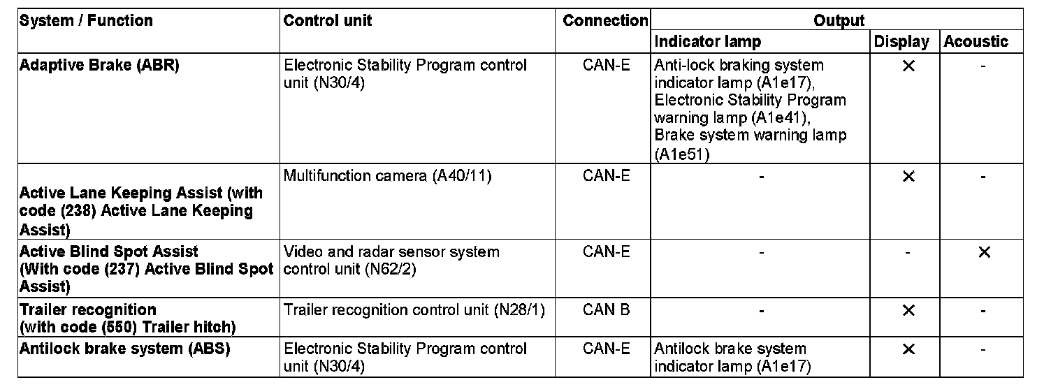 Requests to issue control and warning messages from control units which are connected to the vehicle dynamics CAN (CAN H) are sent by the video and radar sensor system control unit (N62/2) (with code (233) DISTRONIC PLUS or code (237) Active Blind Spot Assist or code (238) Active Lane Keeping Assist) via the chassis CAN to the instrument cluster.