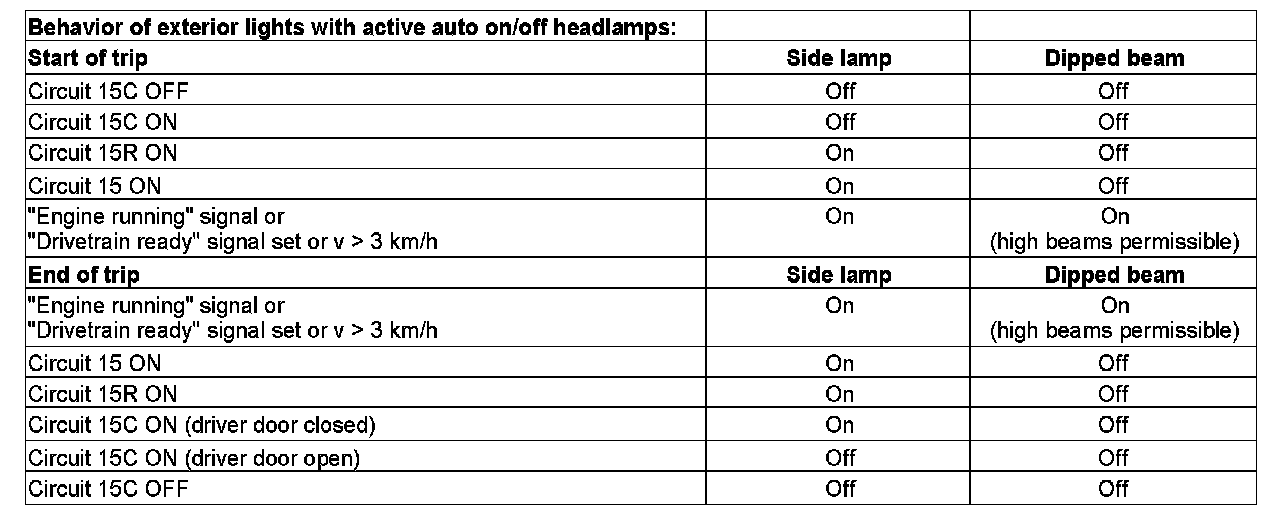 If the light sensor or the rain/light sensor recognizes that it is "dark", the front SAM control unit activates the standing and low beams actuation. The low beams are actuated with full power.