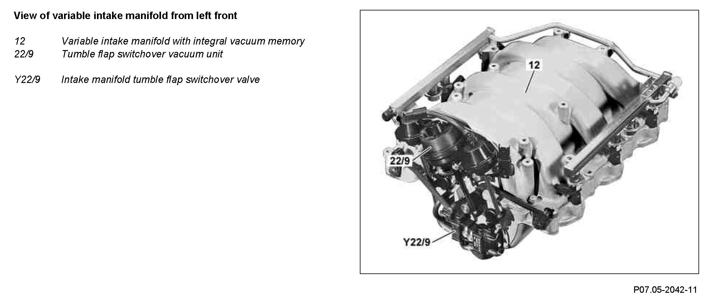For the tumble flap switchover, the ME-SFI [ME] control unit uses a ground signal to actuate the intake manifold tumble flap switchover valve (Y22/9) depending on engine load, coolant temperature and engine speed.