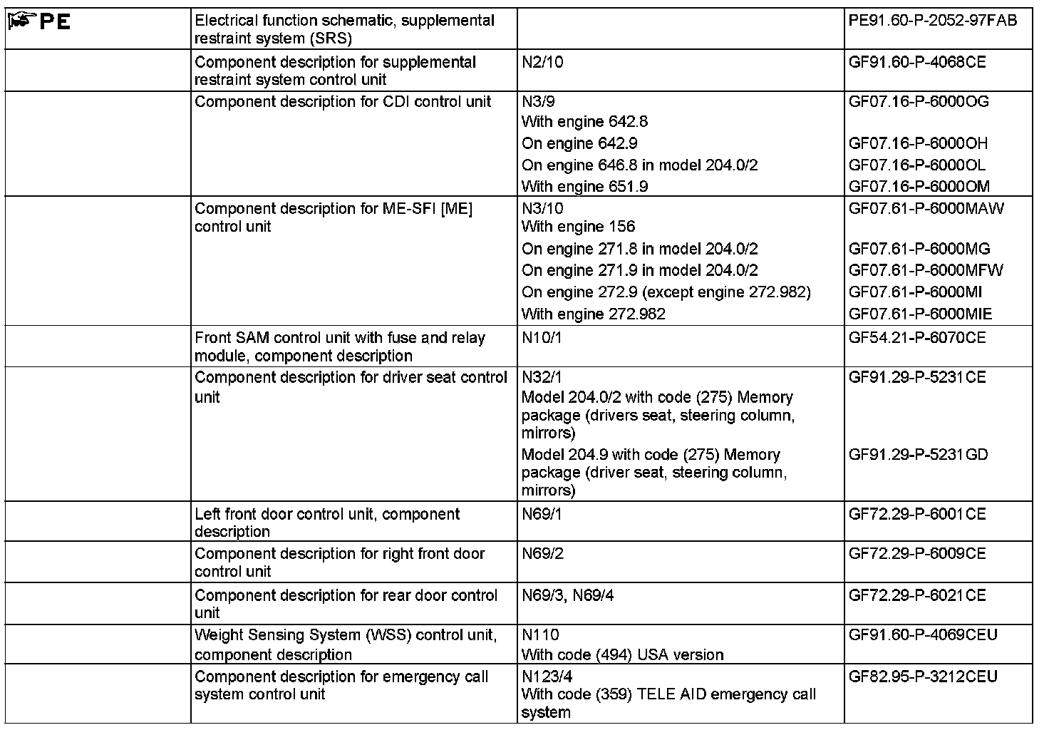 The engine is shut off automatically after a crash event has occurred. The crash signal is sent by the supplemental restraint system control unit over the chassis CAN to the CDI control unit (N3/9) (for diesel engine) or to the ME-SFI [ME] control unit (N3/10) (for gasoline engine). This then causes the engine to be shut off.