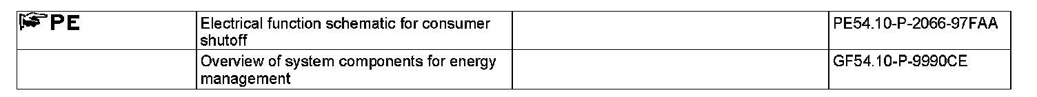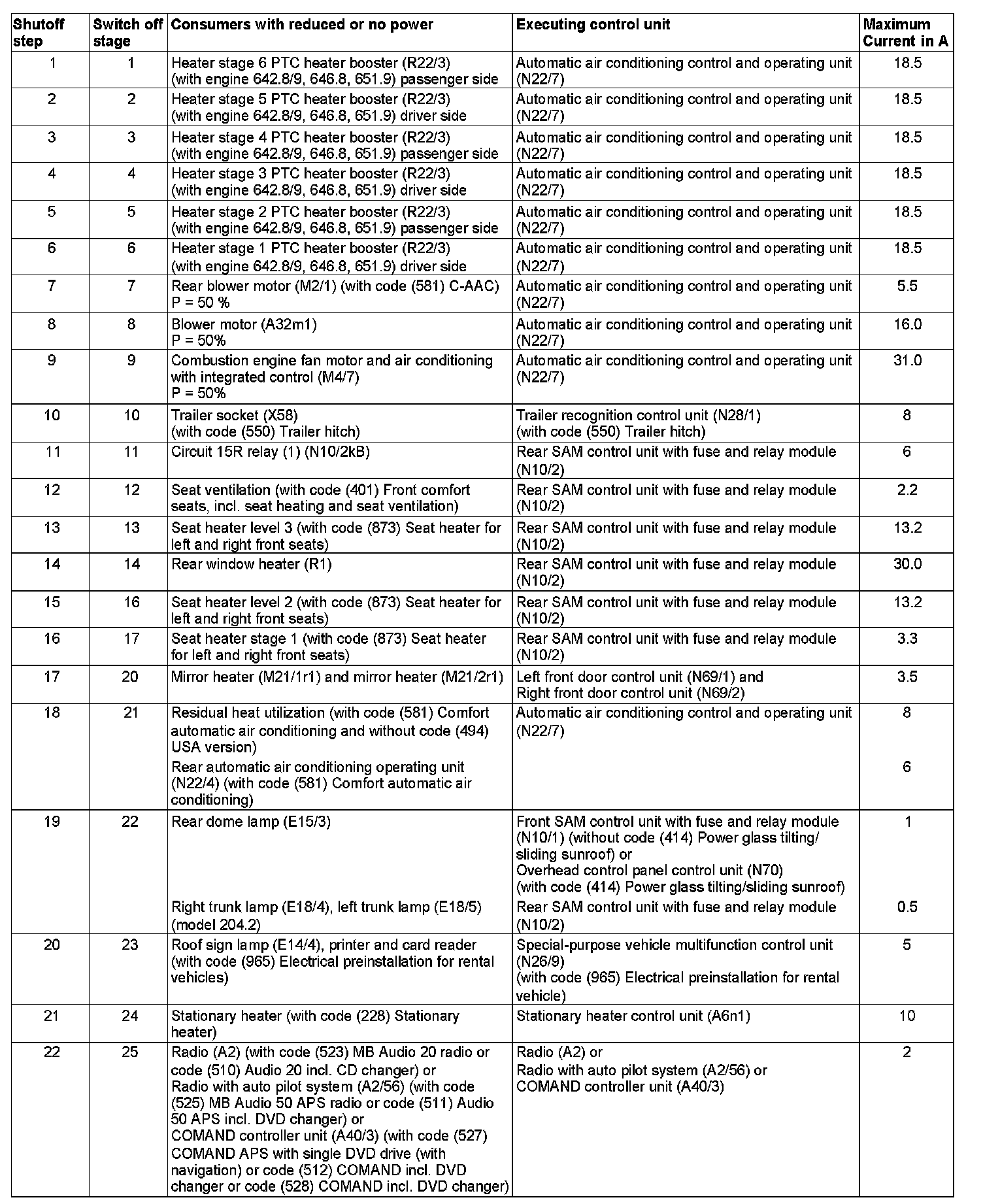 The list includes those consumers whose power supply is reduced or cutoff as part of the engine on energy management function (up to shutoff step 17).