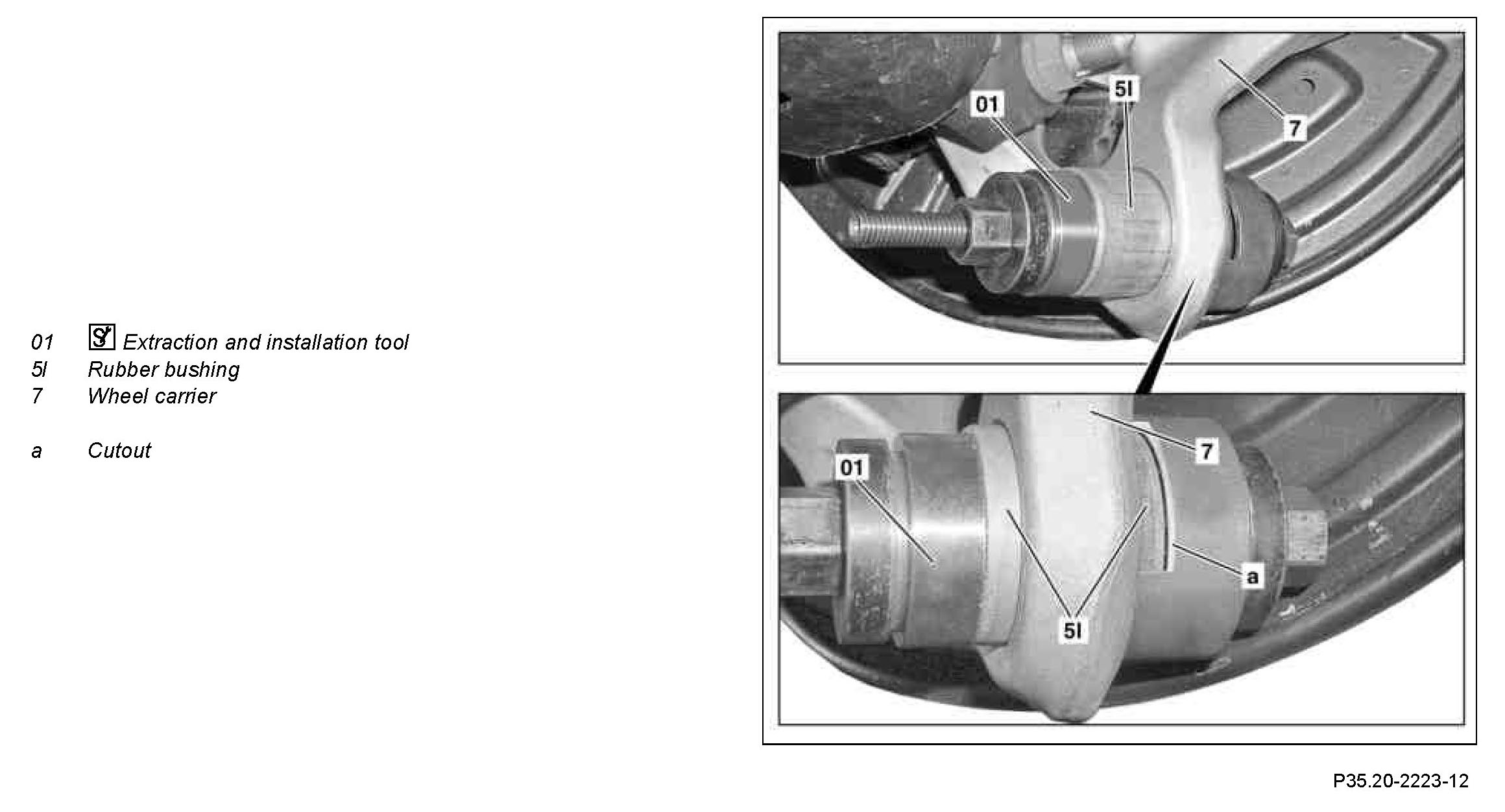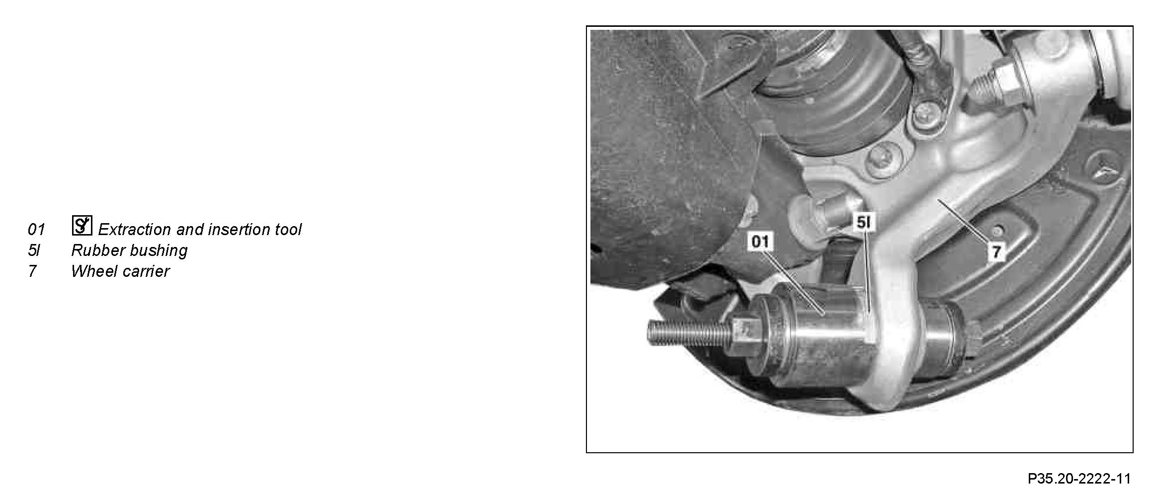1 Pull rubber mount (51) out of wheel carrier (7) using extraction and insertion tool (01).