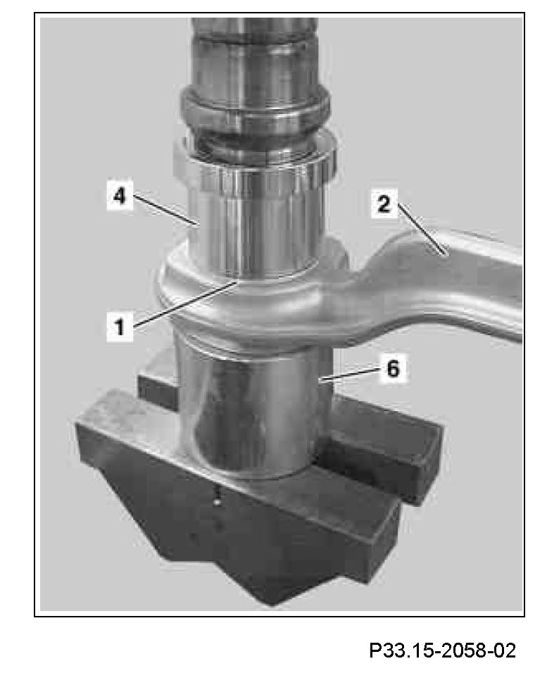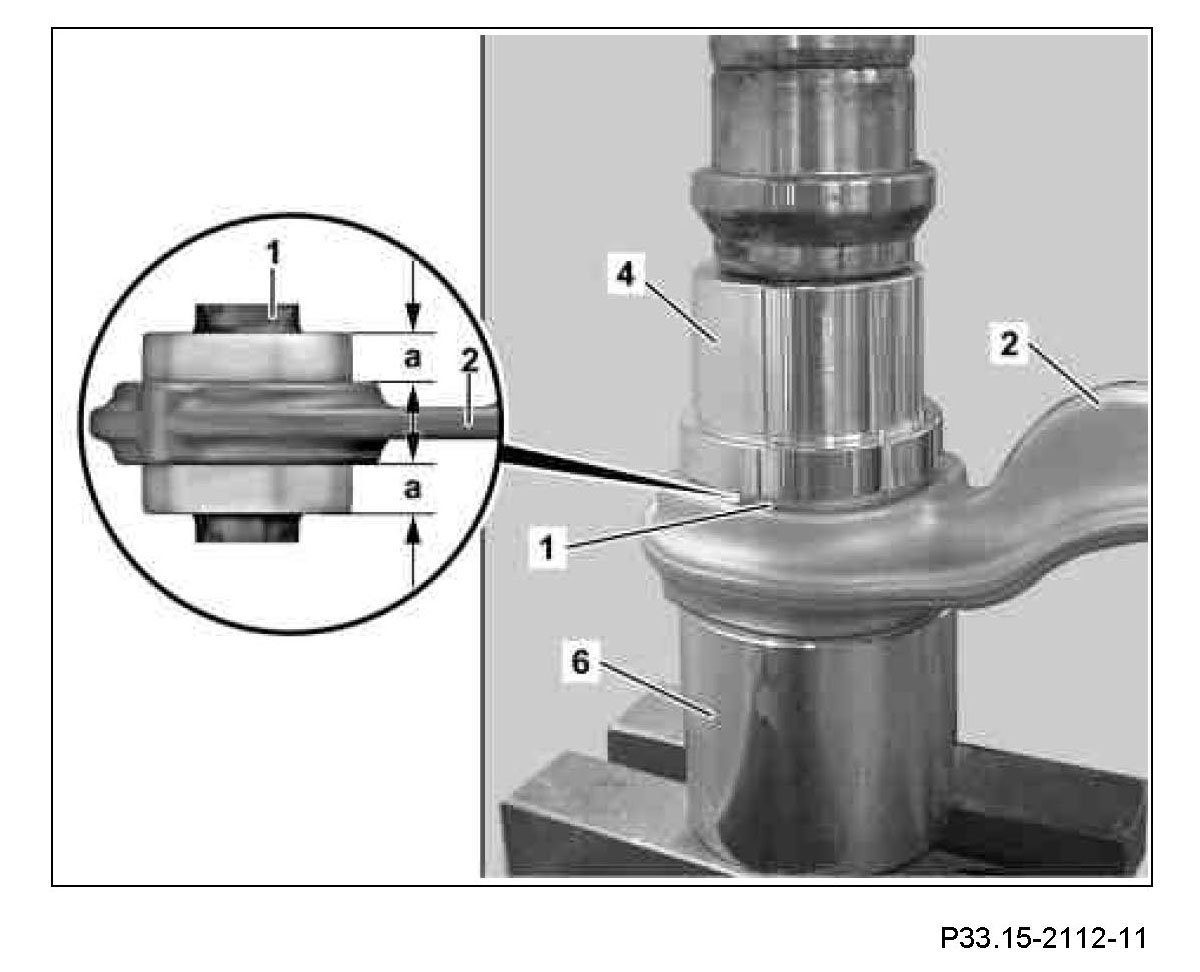 6 Press hydro-mount (1) using press-in tool 220 589 06 43 05 (4) into strut rod (2) until interval (a) is reached.