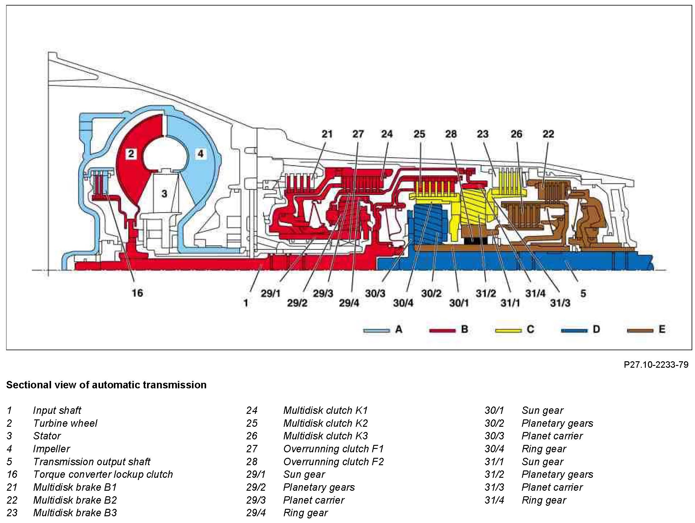 The ring gear (31/4) rotates at transmission input speed due to the mechanical connection to the planet carrier (29/3). The sun gear (31/1) is supported at the housing via the engaged multidisk brake B2 (22), in drive mode, via the locked overrunning clutch F2 (28) and, in overrun mode, via the engaged multidisk clutch K3 (26). The planetary gears (31/2) roll on the fixed sun gear (31/1) and take care of a torque increase when the power is transmitted from the ring gear (31/4) to the planet carrier (31/3). The planet carrier (31/3) moves at reduced speed in the direction of engine rotation.