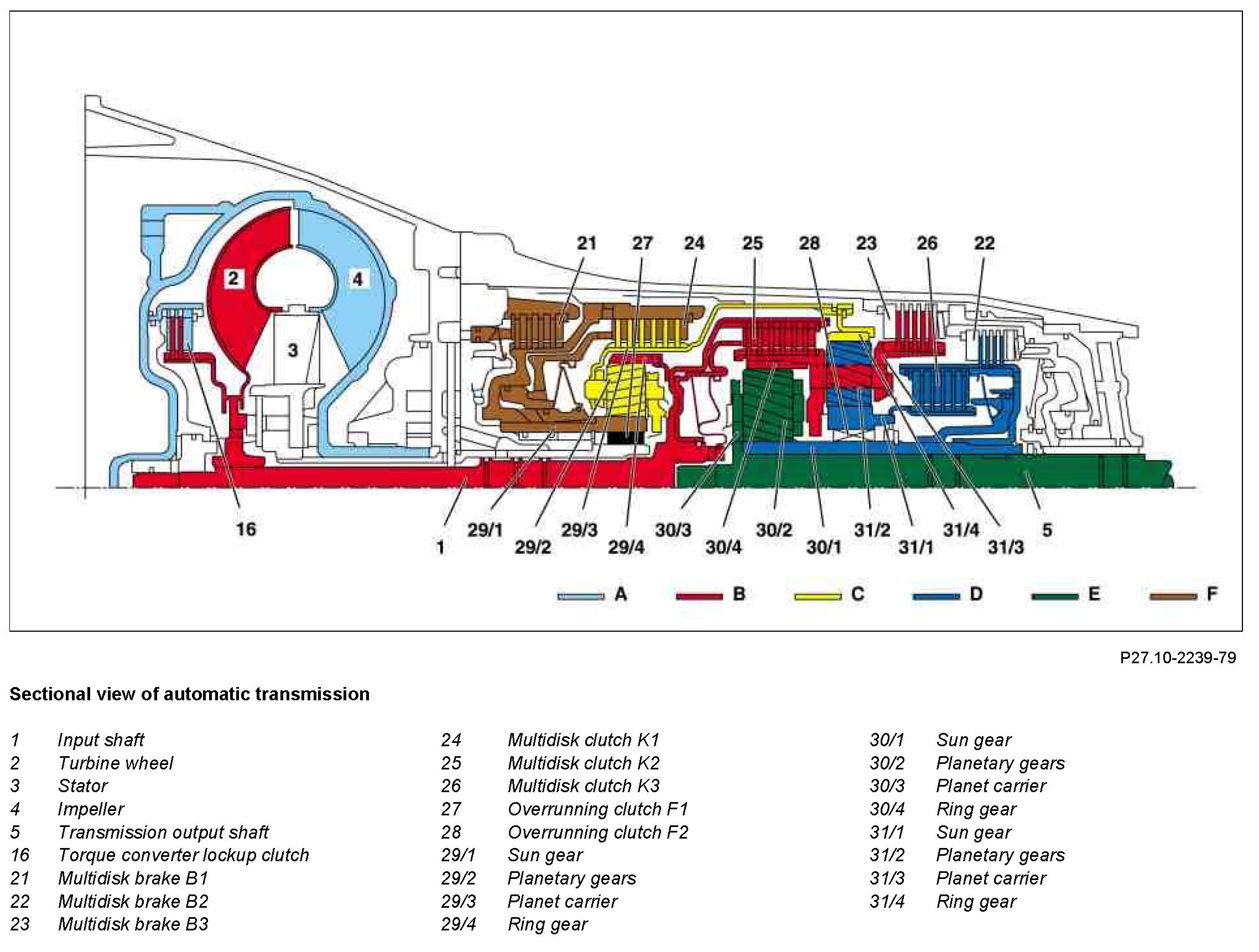 The input shaft (1) drives the ring gear (29/4). In drive mode, the sun gear (29/1) is supported at the housing via the locked overrunning clutch F1 (27) and, in overrun mode, via the engaged multidisk brake B1 (21). The planet gears (29/2) revolve around the fixed sun gear (29/1) and provide an increase in torque between the ring gear (29/4) and the planet carrier (29/3). The planet carrier (29/3) moves at reduced speed in the direction of engine rotation.