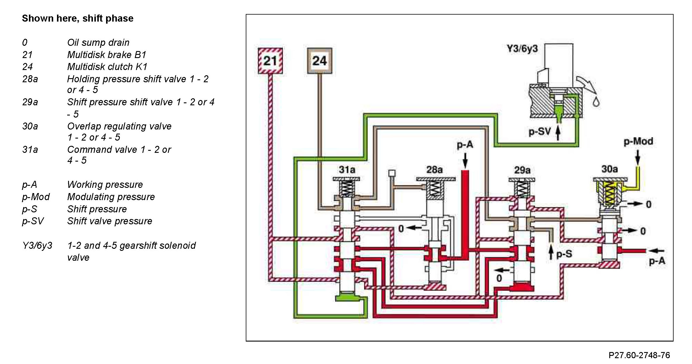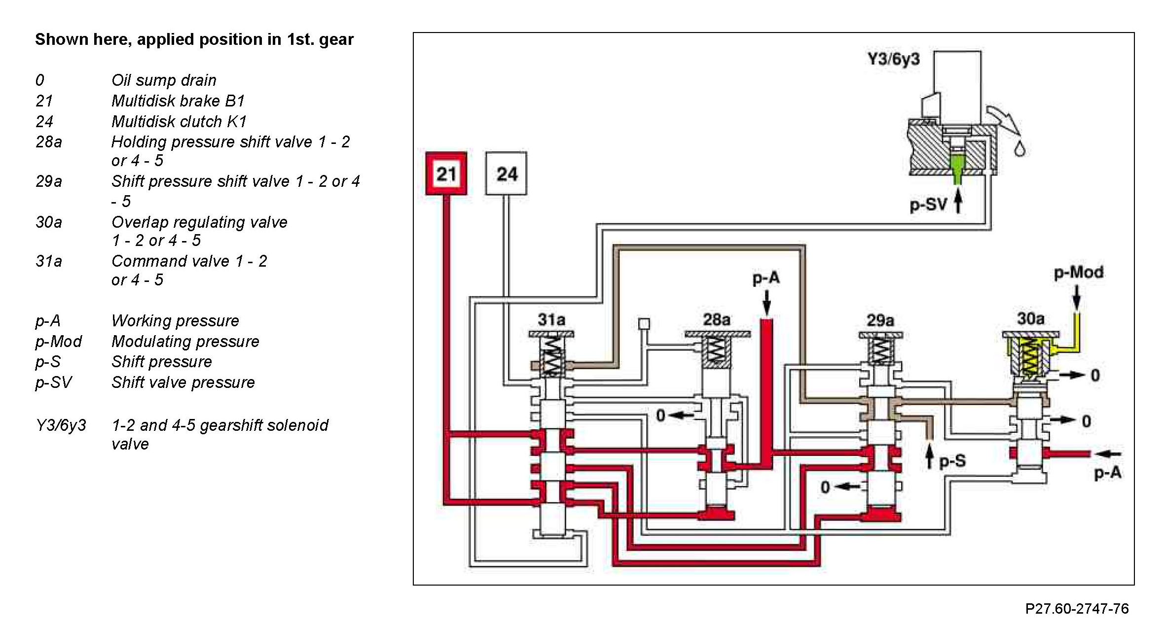 The face of the command valve 1 - 2 or 4 - 5 (31a) is kept depressurized by gearshift solenoid valve 1-2 and 4-5 (Y3/6y3). Working pressure (p-A) is applied to multidisk brake B1 (21) through holding pressure shift valve 1 - 2 or 4 - 5 (28a).