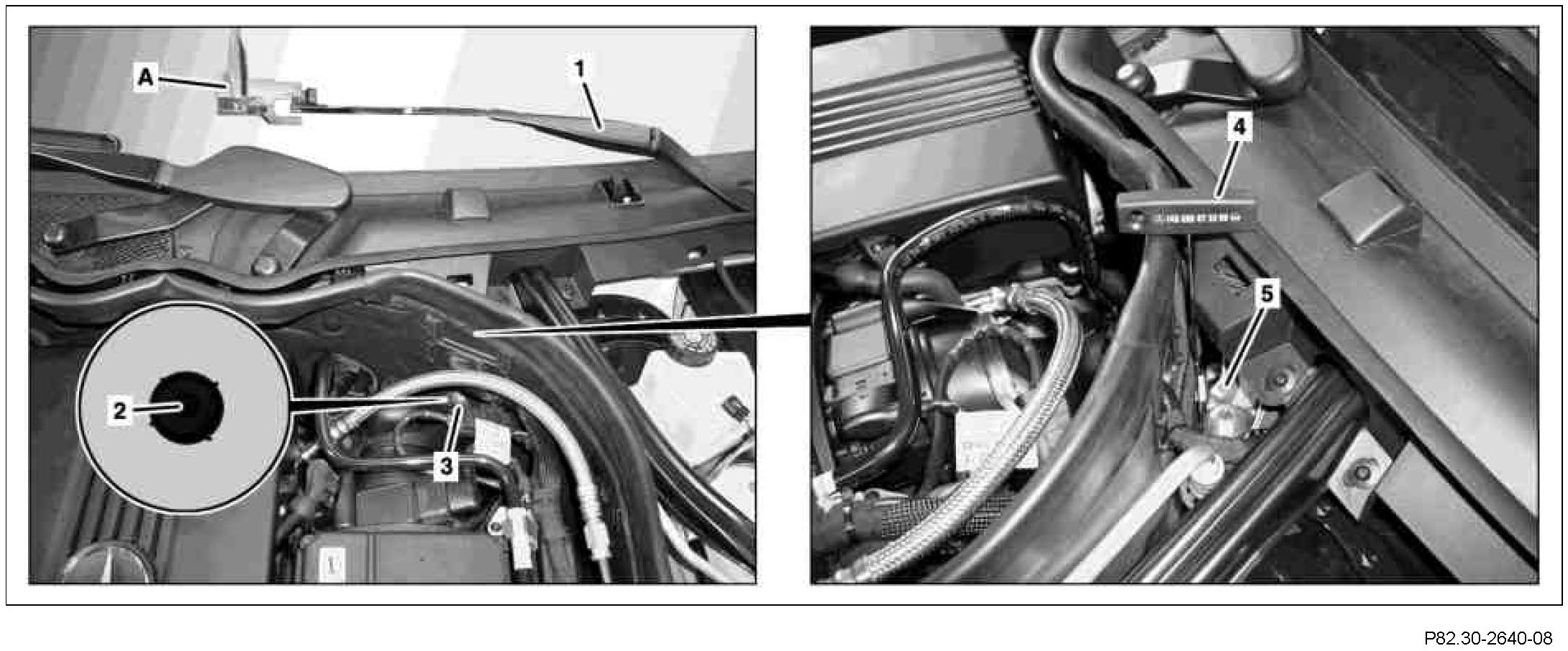 8 Close hood and remove angle gauge (A) from driver-side wiper arm (1).