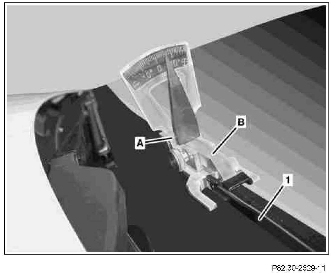 13 Remove angle gauge (A) together with adapter (B) from driver-side wiper arm (1).