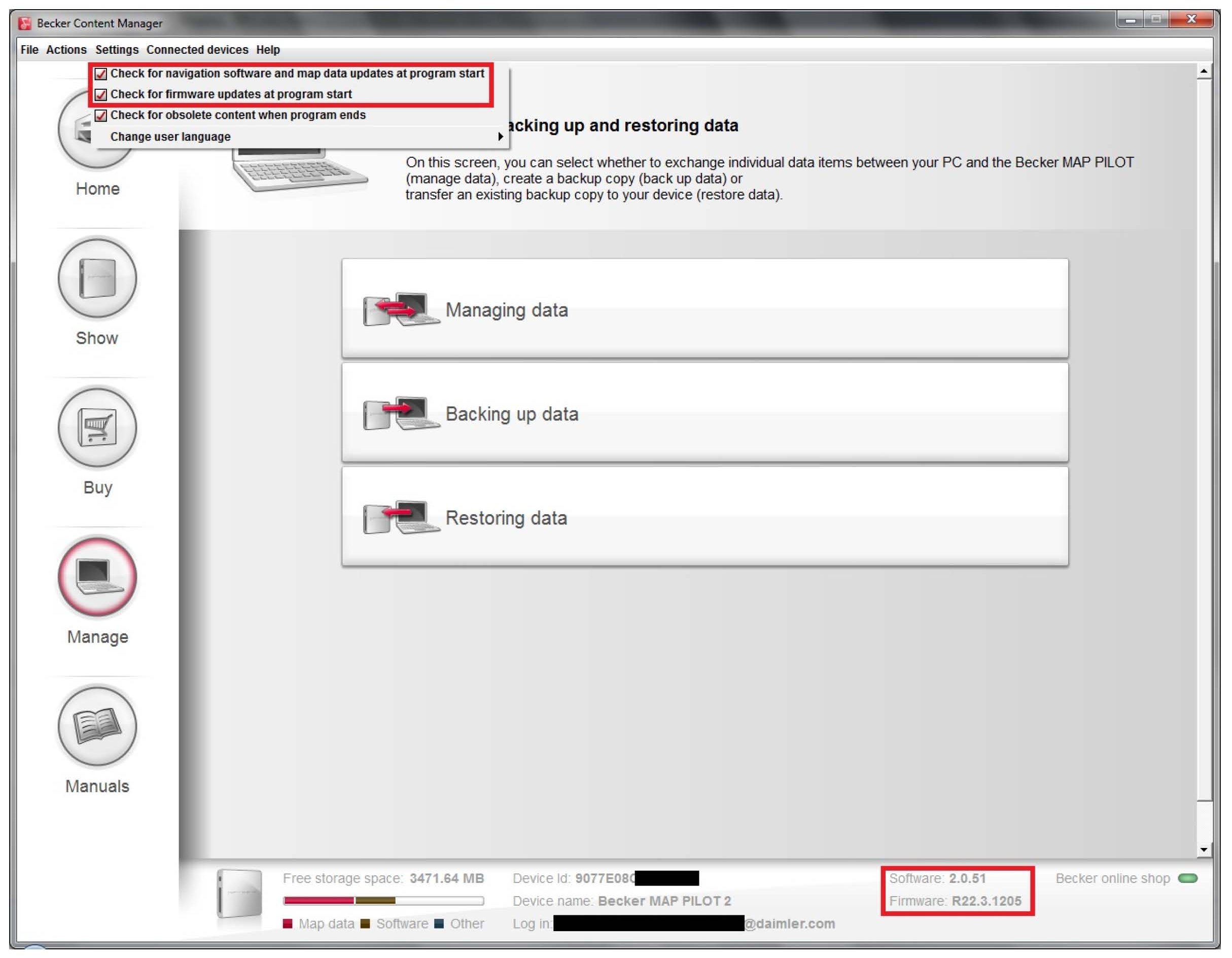 - The updates of the navigation software (PND software) including firmware must be performed using the current Becker Content Manager. The checks for updates on launching the Becker Content Manager must be activated in the "Settings" menu (see attachment). To update the navigation software, it may be necessary to perform a free-of-charge update of the map data at the same time. Detailed information can be found at www.beckermappilot.com. The update process can take up to several hours depending on your Internet connection.