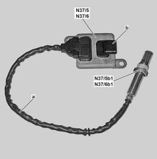 The NOx sensors detect the NOx and the O2 concentration in exhaust after every NOx storage catalytic converter and passes this information to the nitrogen oxides sensors control units in the form of voltage signals. These process the information and transmit it via the drive train sensor CAN (CAN I) to the ME-SFI [ME] control unit (N3/10).