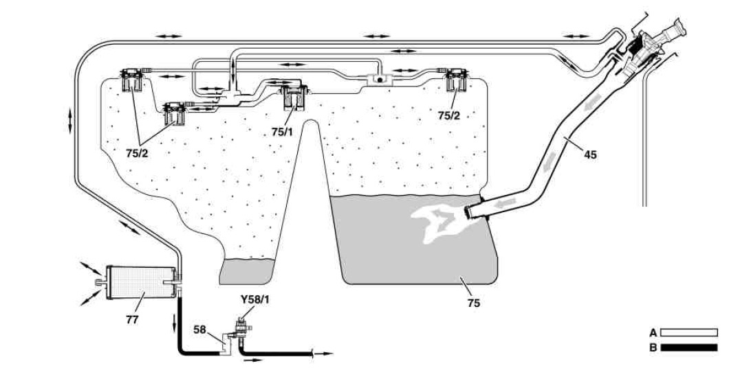 When the engine is running, the fuel vapors stored in the activated charcoal canister, are drawn off through the purge control valve (Y58/1) and combusted in the engine.