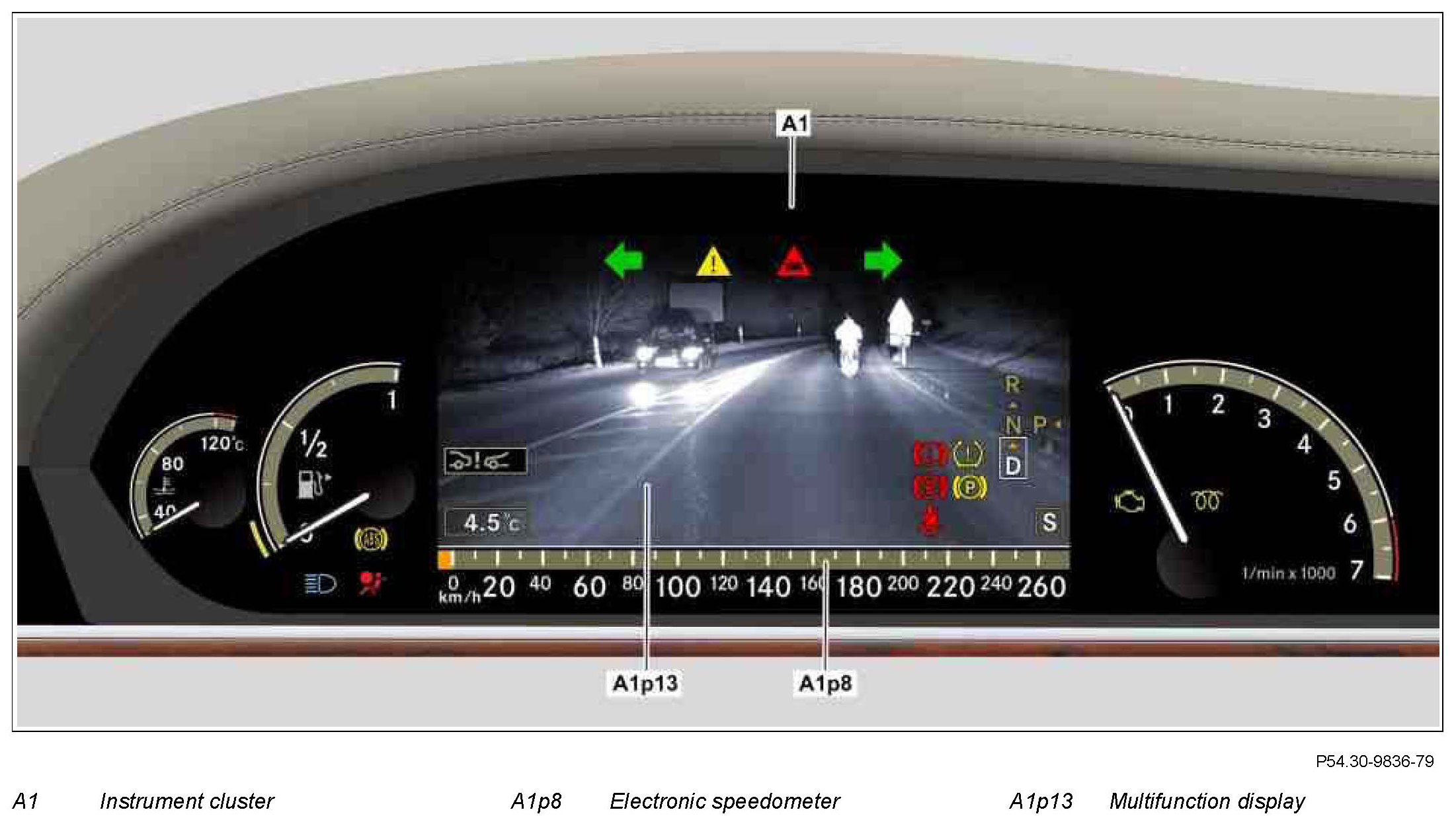 The Night View Assist control unit transmits the processed data via the digital video interface (LVDS line) to the instrument cluster. The multifunction display replaces the standard display of the electronic speedometer with a bar graph display with video image.