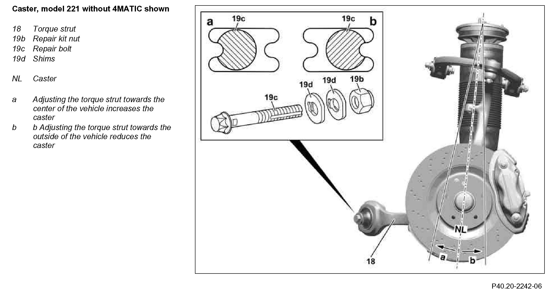 The standard bolt (19a) is centered by lock tabs in the front axle carrier. Inserting the graduated disks (19d) onto the lock tabs, enables the repair bolt (19c) to be installed through the groove on the right or left.