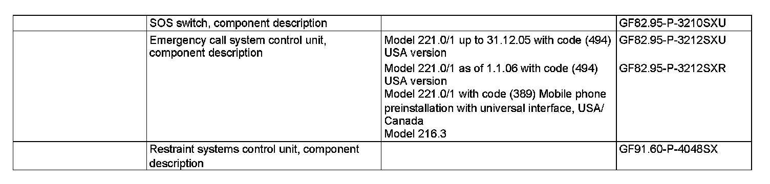 The restraint systems control unit performs a self-test cyclically. Any lighting of the red light emitting diode (LED) in the SOS pushbutton switch (S93/3) in normal mode indicates a fault in the Telematic Alarm Identification on Demand (emergency call system) (TELE AID). The corresponding error message is then shown on the COMAND display (A40/8) and in the multifunction display (A1p13) of the instrument cluster (A1). The red LED in the SOS pushbutton switch is illuminated until circuit 15 is switched off or the fault has been rectified. The SOS pushbutton switch is monitored. A stuck SOS pushbutton switch is detected. The fault signal is ignored and TELE AID remains operational.