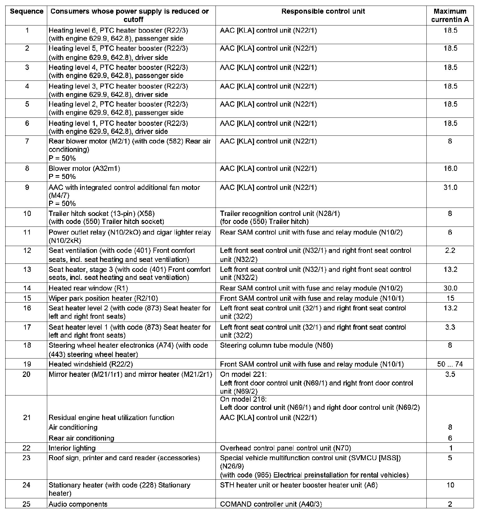 - Rear seat control unit (N25/6) (model 221 with code (223) Rear seat bench with electrically adjustable outer seats with PRE-SAFE positioning function for outer seats and outer head restraints or with code (276) Memory in rear or with code (402) Rear comfort seats incl. seat heating and seat ventilation or with code (872) Electrically heated left and right rear seats)
