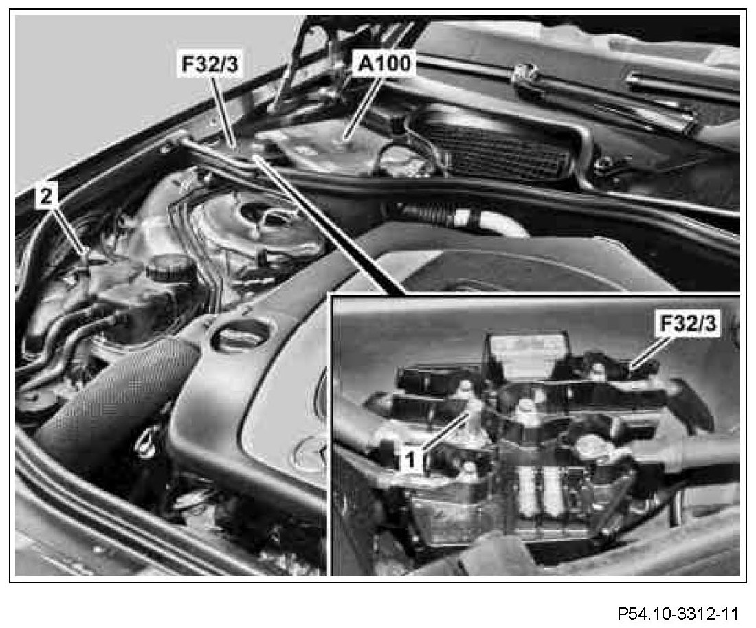 If with model 221.095/195 the power output of the high-voltage battery (A100g1) is extremely low (P < 8 kW) when the hybrid drive system is started, startability can be reestablished by means of energy transfer from the 12 V on-board electrical system to the high-voltage on-board electrical system. If an external charger is connected and, with the engine hood open, the DC/DC converter control unit measures a voltage of more than U = 12.8 V in the 12 V on-board electrical system, energy with a maximum output of P = 500 W is transferred via the on-board electrical system battery and the DC/DC converter control unit to the high-voltage on-board electrical system and the high-voltage battery is charged (only with circuit 15 ON).