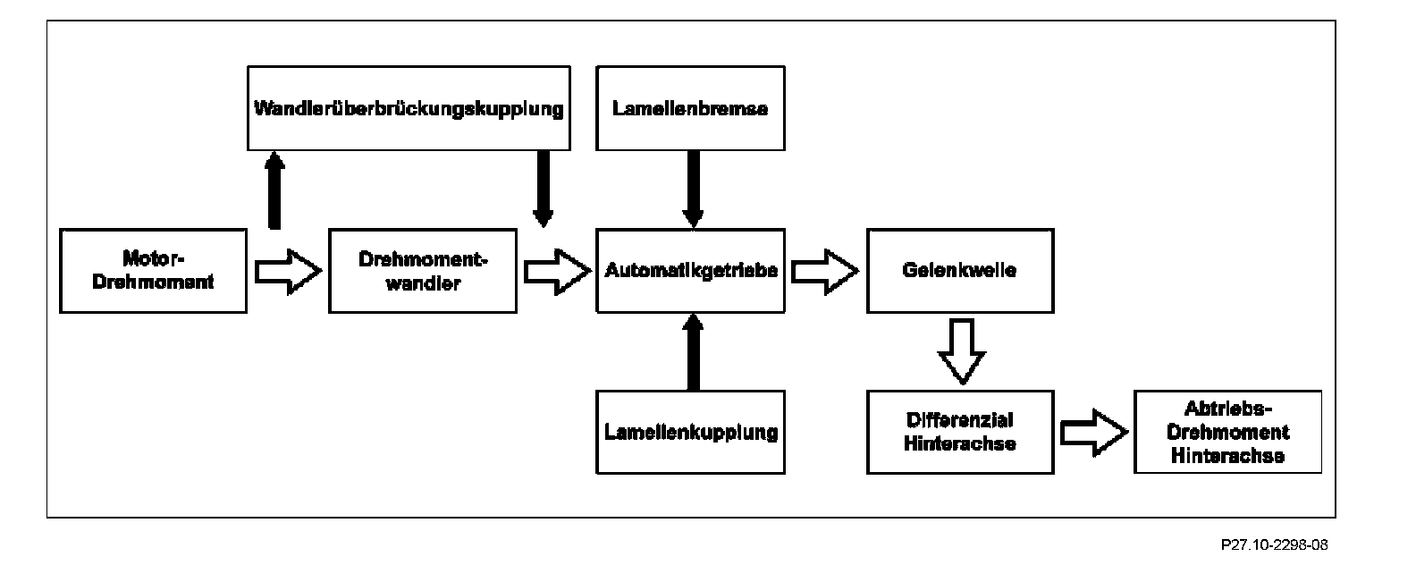 The term "power flow" refers to the transmission paths of driving power and engine torques. The engine torques are transmitted to the drive wheels via the mechanical-hydraulic connection between the engine, torque converter, the downstream automatic transmission and differential.