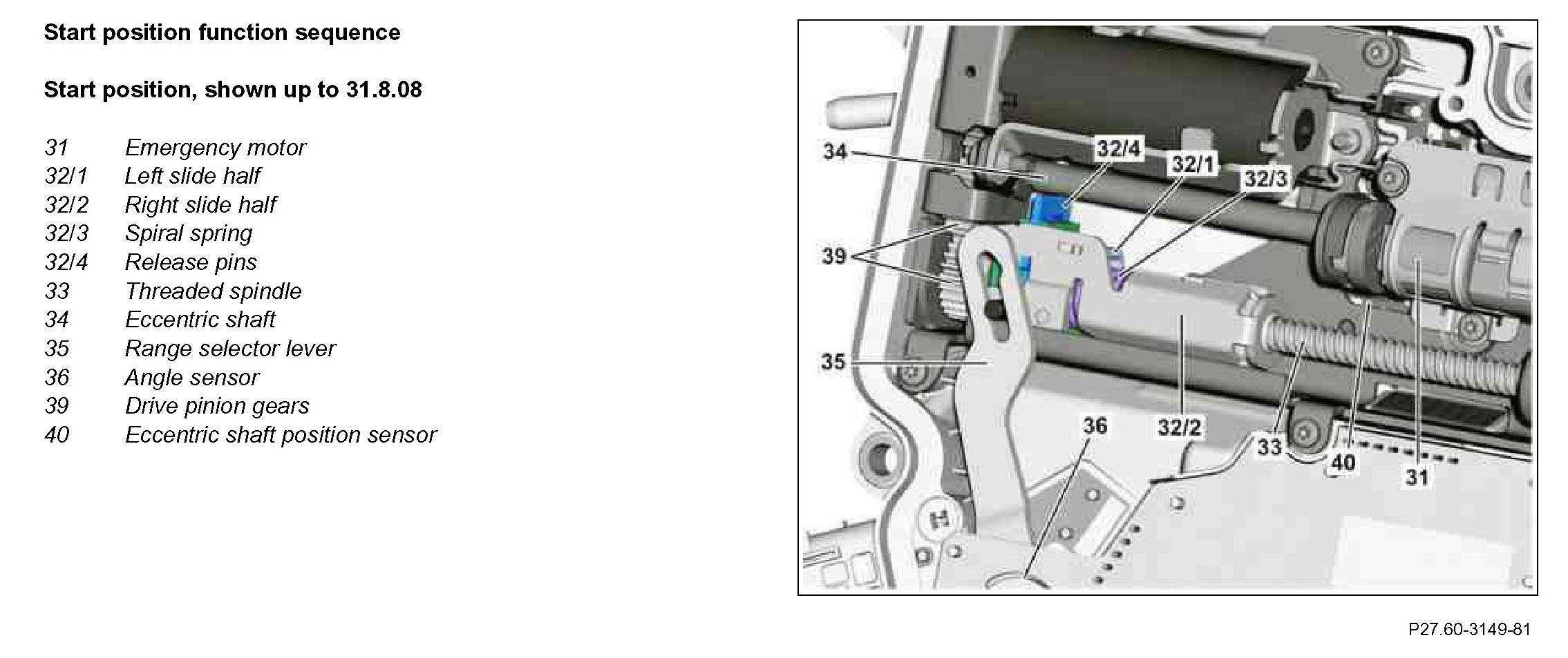 The pre-compressed coil spring pushes the two carriage halves apart. The right carriage half slides along the threaded spindle to the right and pushes the range selector lever to position "P". The eccentric shaft continues to rotate, until the emergency motor is no longer actuated. The actual position of the eccentric shaft is recorded by the eccentric shaft position sensor.