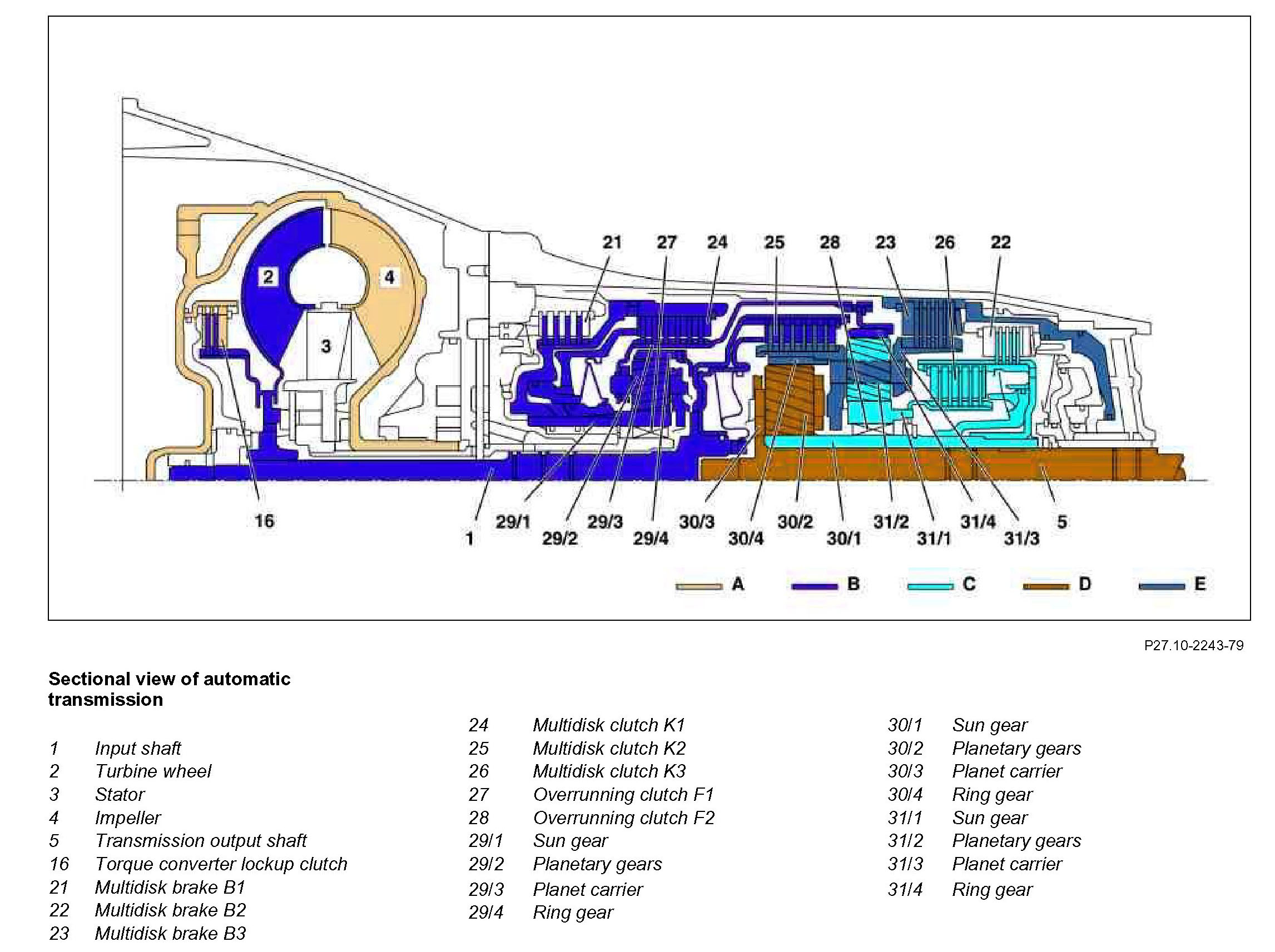 The planet carrier is held securely at the transmission housing by the engaged multidisk brake B3 (23)31/3 The ring gear (31/4) rotates at the transmission input speed (B) due to the mechanical connection to the locked planetary gear set. The planet gears (31/2) turn between the ring gear (31/4) and the sun gear (31/1). Due to the held planet carrier (31/3) a direction reversal takes place so that the sun gear (31/1) turns in the opposite direction to the direction of engine rotation.