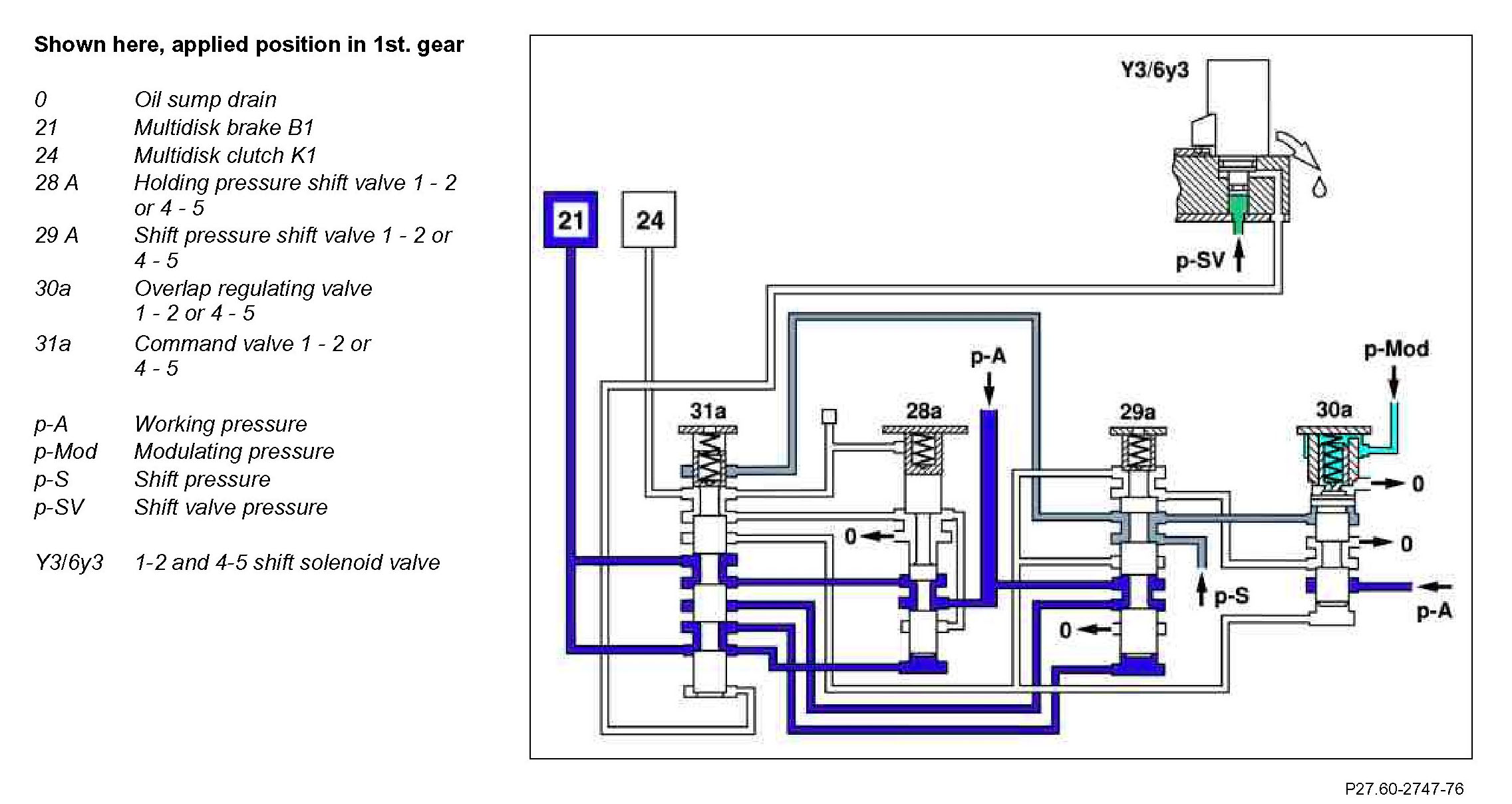 After a successful gear-shift operation, the pressure at the end face of the command valve 1 - 2 or 4 - 5 (31a) is reduced via the shift solenoid valve 1-2 and 4-5 and the command valve is moved to its basic position. The working pressure (p-A) is routed via holding pressure shift valve 1 - 2 or 4 - 5 (28a) and command valve 1 - 2 or 4 - 5 (31a) to the multidisk clutch K1 (24).