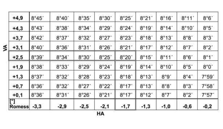 1 Obtain the caster value from the table taking into account the front axle (FA) level values and rear axle (RA) level values measured previously.